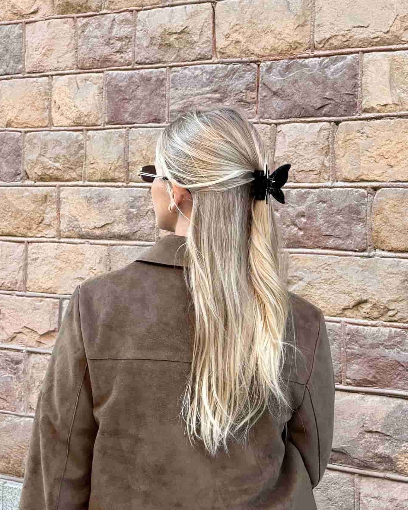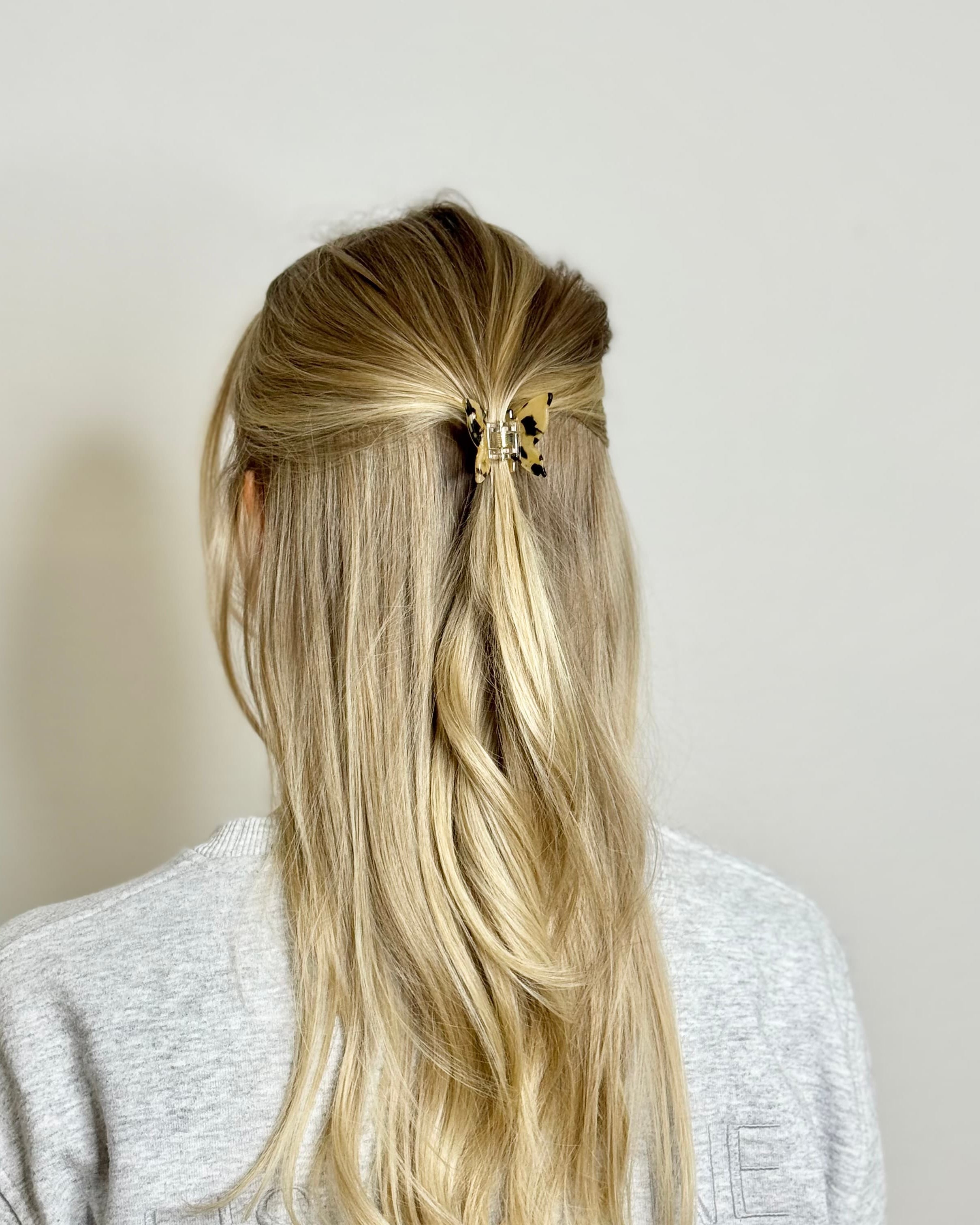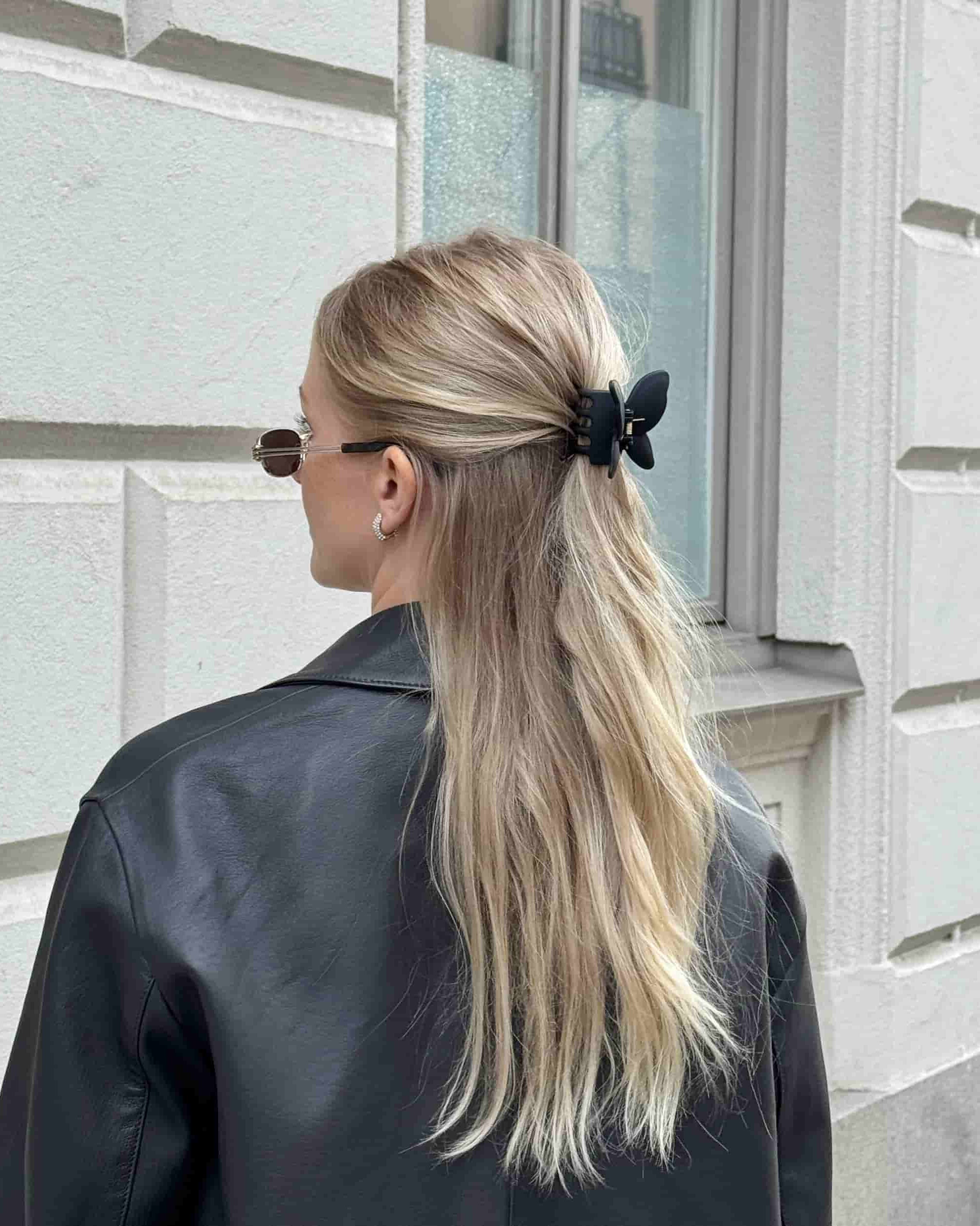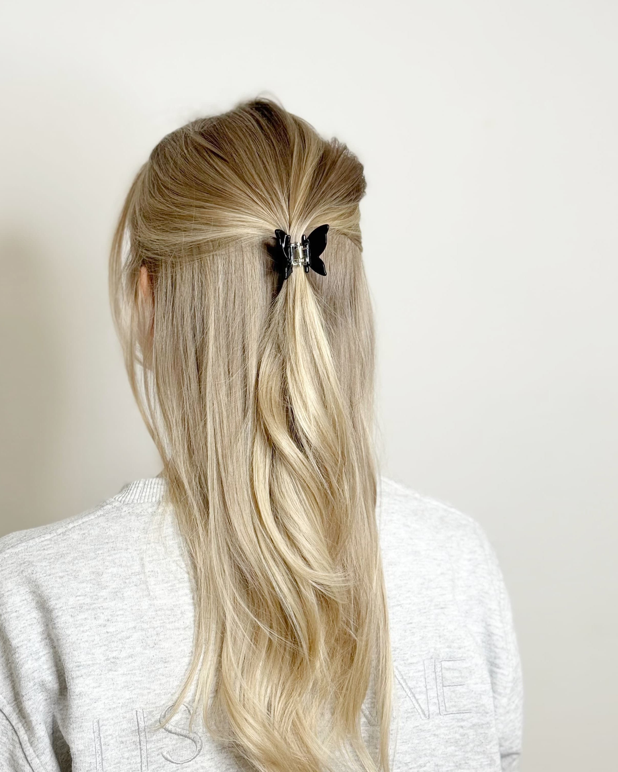 - Sätt upp håret i en halvuppsättning med en medium butterfly clip, ett enkelt sätt att få bort håret från ansiktet men ändå behålla längden.