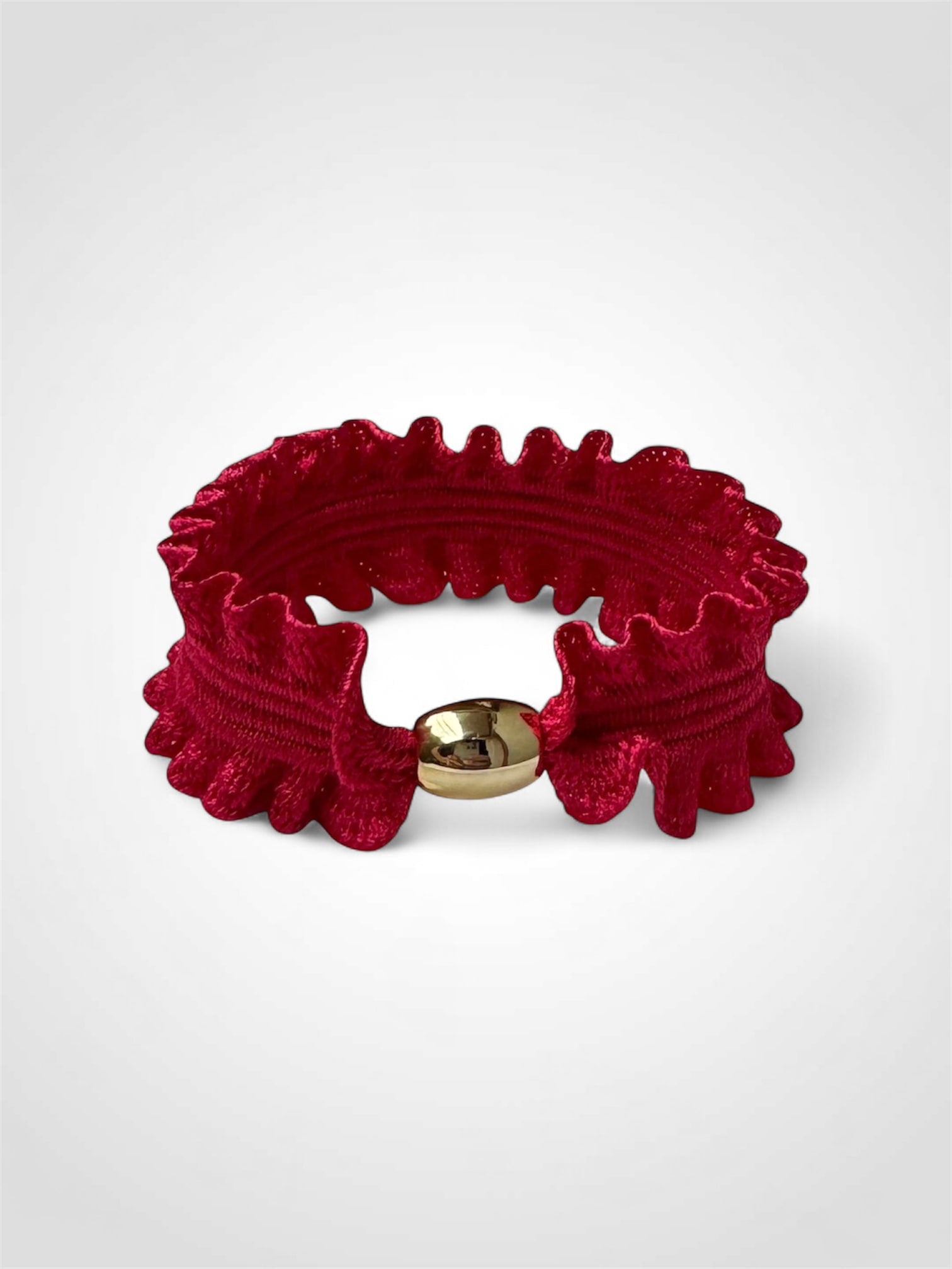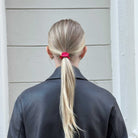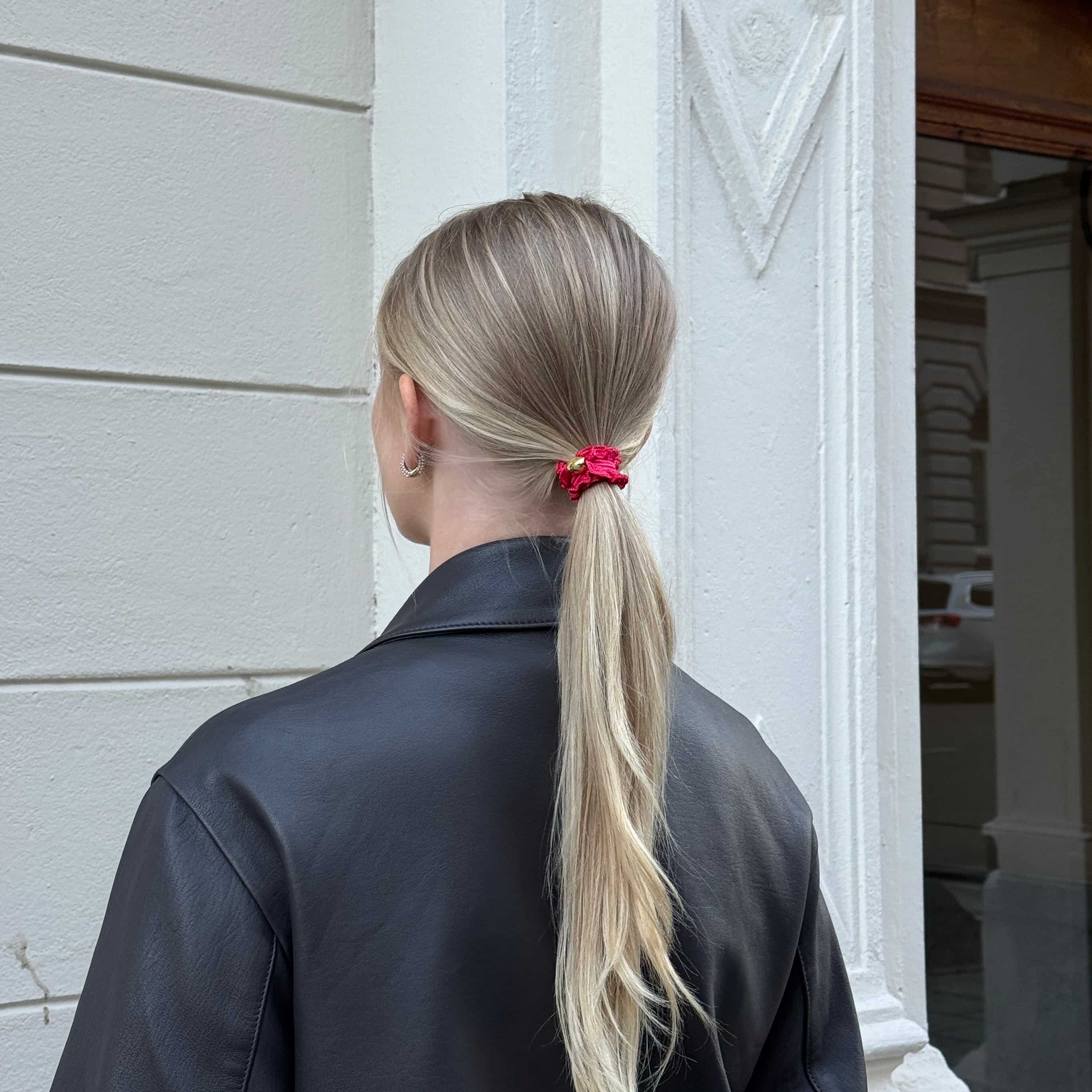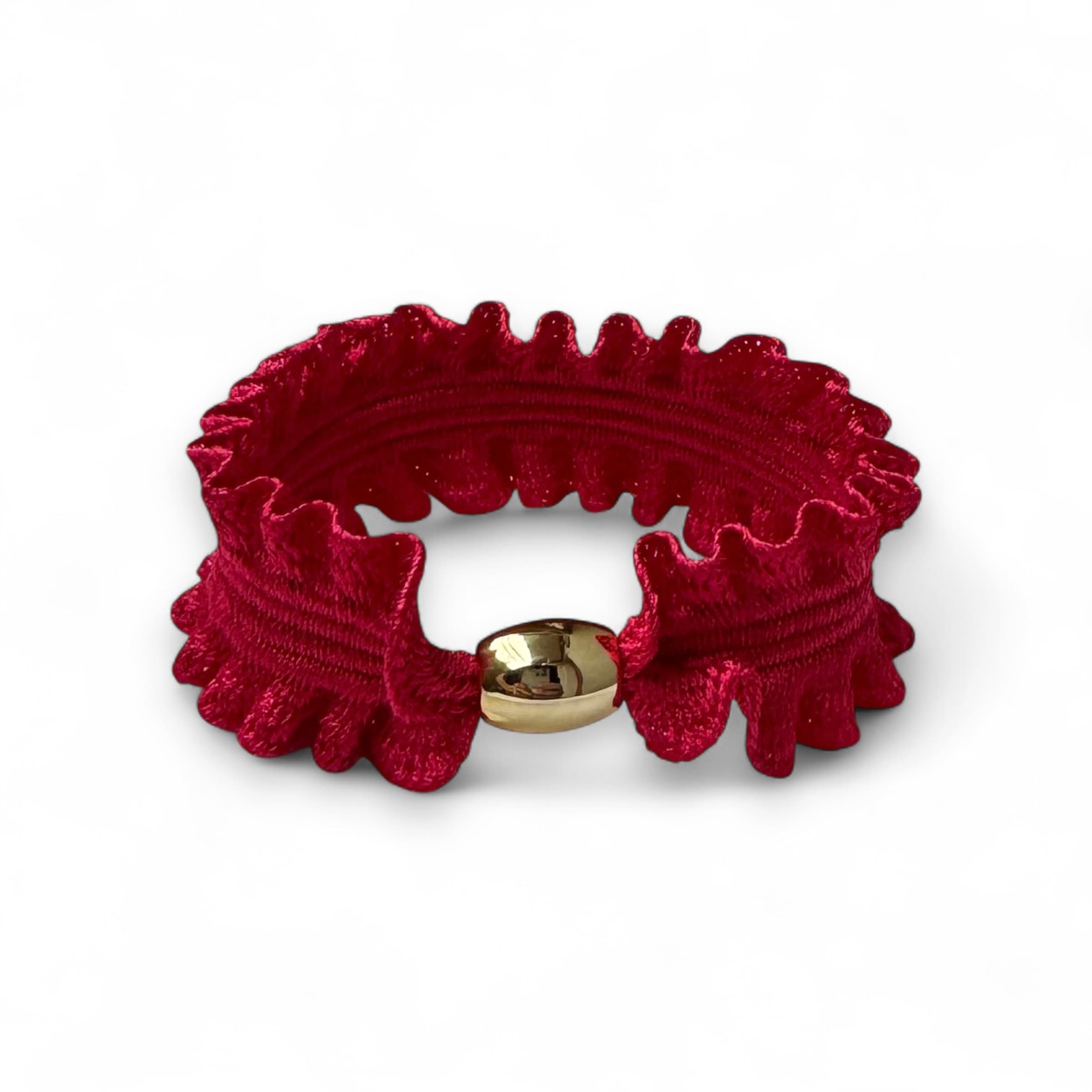 En röd hårsnodd med mjuk volang och en guldfärgad pärla – fin både i håret och runt handleden. Den perfekta lilla detaljen när du vill sätta upp håret med något som känns både praktiskt och personligt.