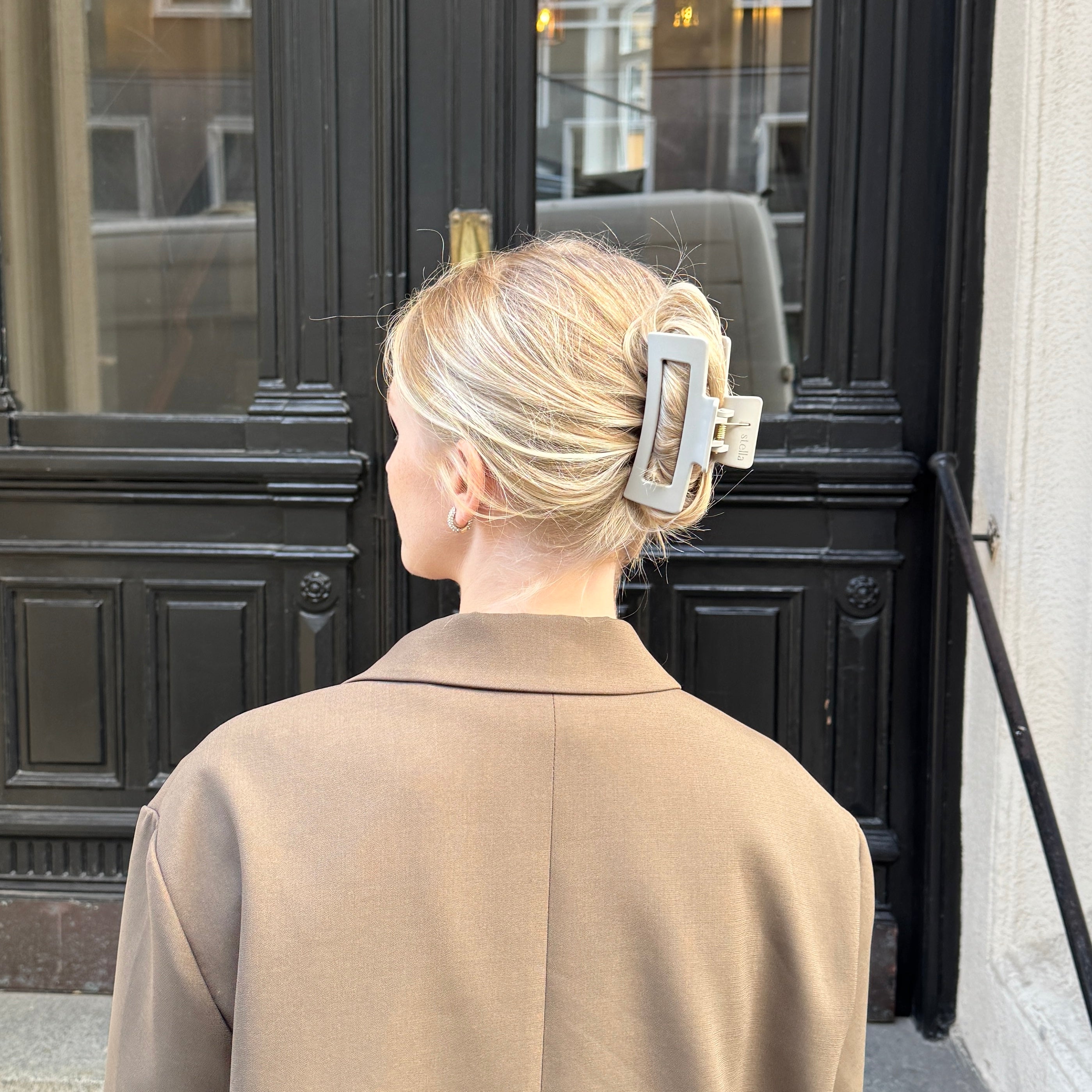 En stor beige hårklämma som verkligen håller håret på plats hela dagen. Den matta finishen och enkla formen ger ett stilrent uttryck. Men det bästa, den sitter där den ska, även i tunt, tjockt eller glatt hår tack vara dess starka grepp och de extra piggarna på insidan.