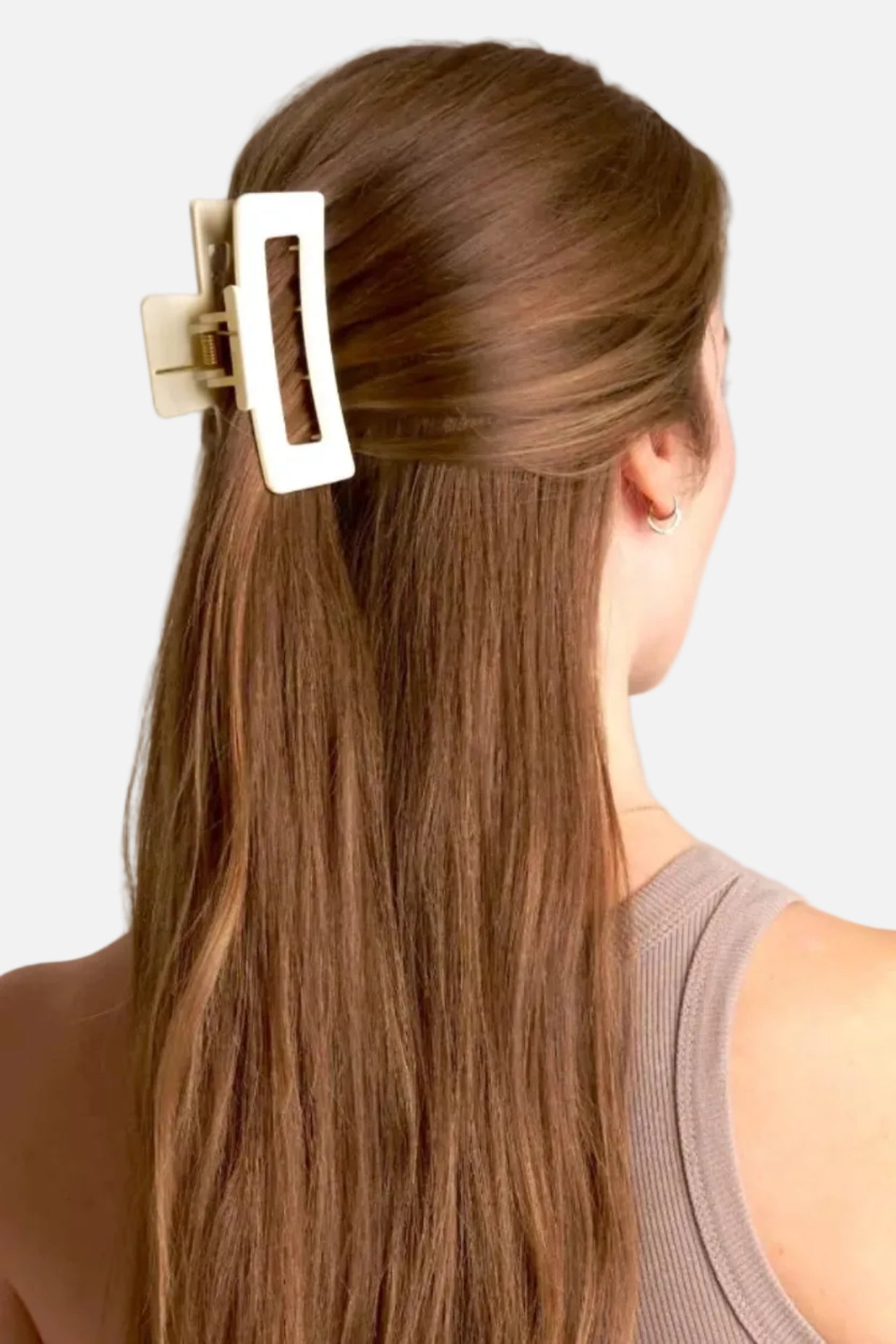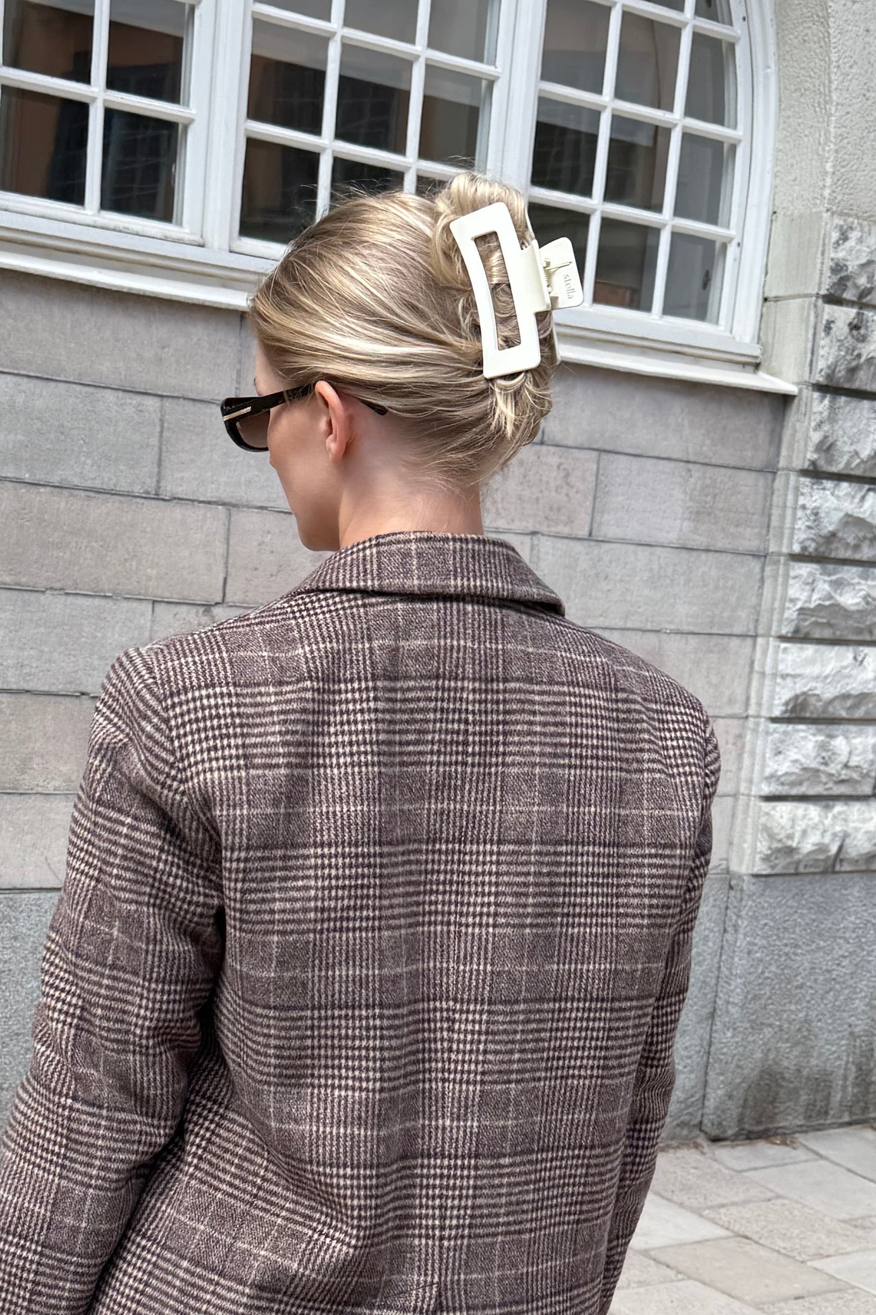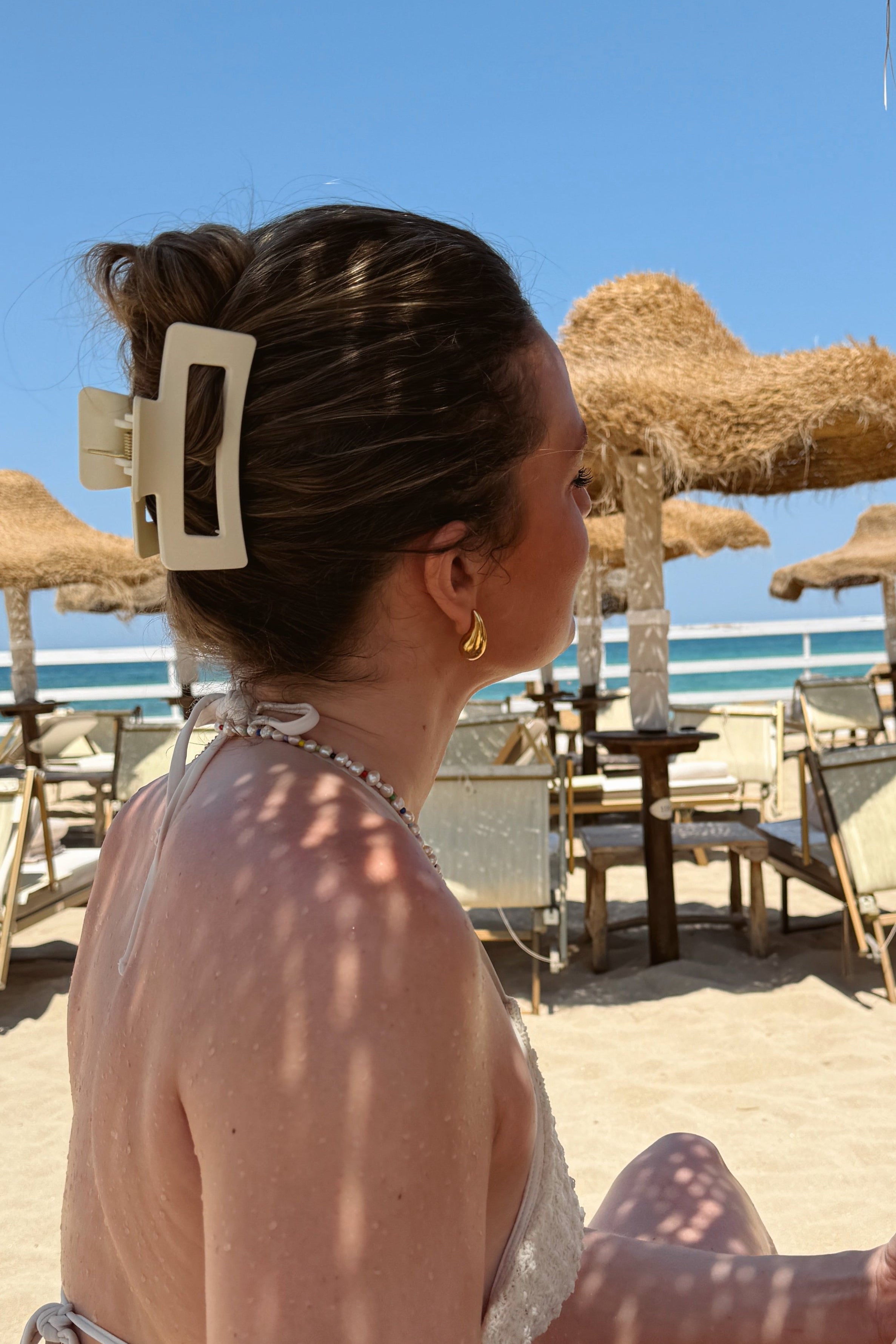 En stor cremévit hårklämma som verkligen håller håret på plats hela dagen. Den matta finishen och enkla formen ger ett stilrent uttryck. Men det bästa, den sitter där den ska, även i tunt, tjockt eller glatt hår tack vara dess starka grepp och de extra piggarna på insidan.
