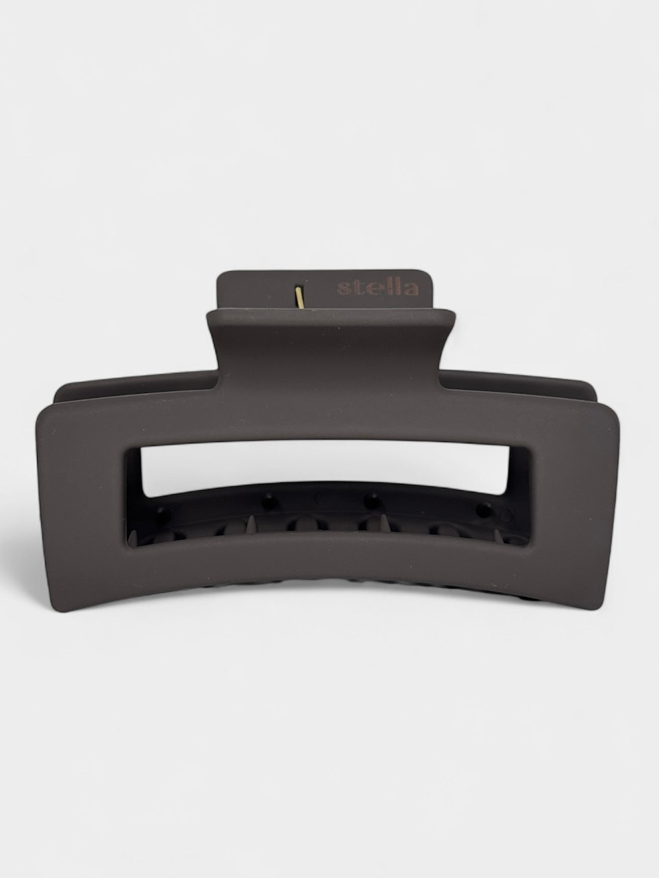 En stor mörkbrun hårklämma som verkligen håller håret på plats hela dagen. Den matta finishen och enkla formen ger ett stilrent uttryck. Men det bästa, den sitter där den ska, även i tunt, tjockt eller glatt hår tack vara dess starka grepp och de extra piggarna på insidan.