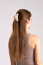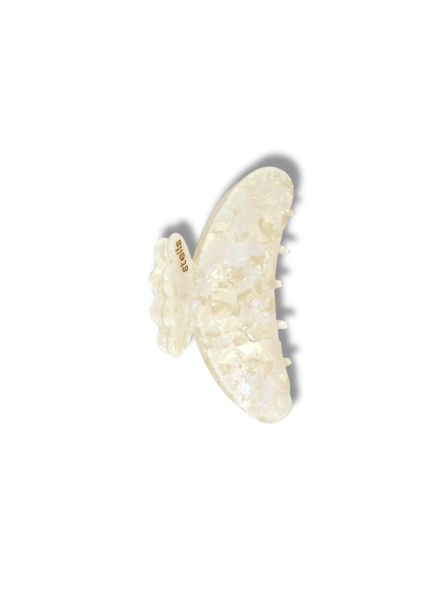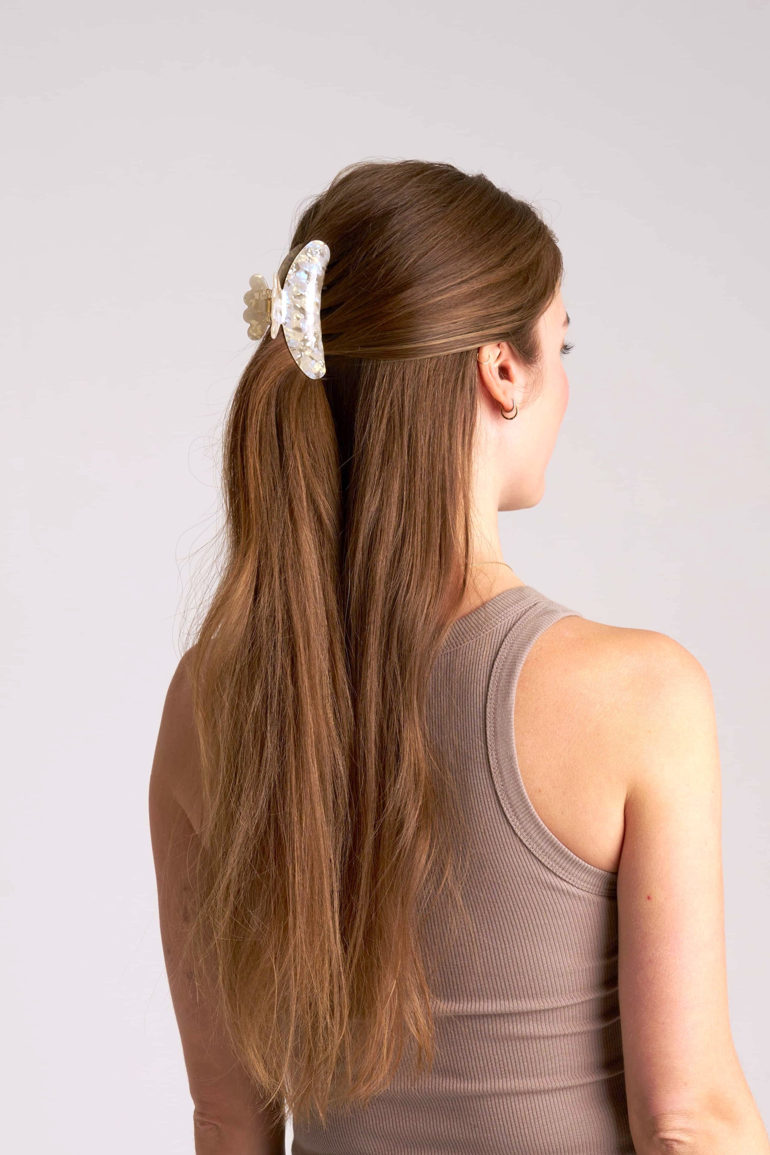 En champagnefärgad hårklämma i mediumstorlek med vågformad design och rundade kanter – mjuk både i känsla och uttryck. Perfekt när du vill få undan håret snabbt och enkelt, men ändå behålla en lätt och fin känsla. Passar lika bra till en halvuppsättning som till att samla ihop håret baktill.