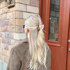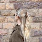 En brun och vit hårklämma i mediumstorlek med vågformad design och rundade kanter – mjuk både i känsla och uttryck. Perfekt när du vill få undan håret snabbt och enkelt, men ändå behålla en lätt och fin känsla. Passar lika bra till en halvuppsättning som till att samla ihop håret baktill.