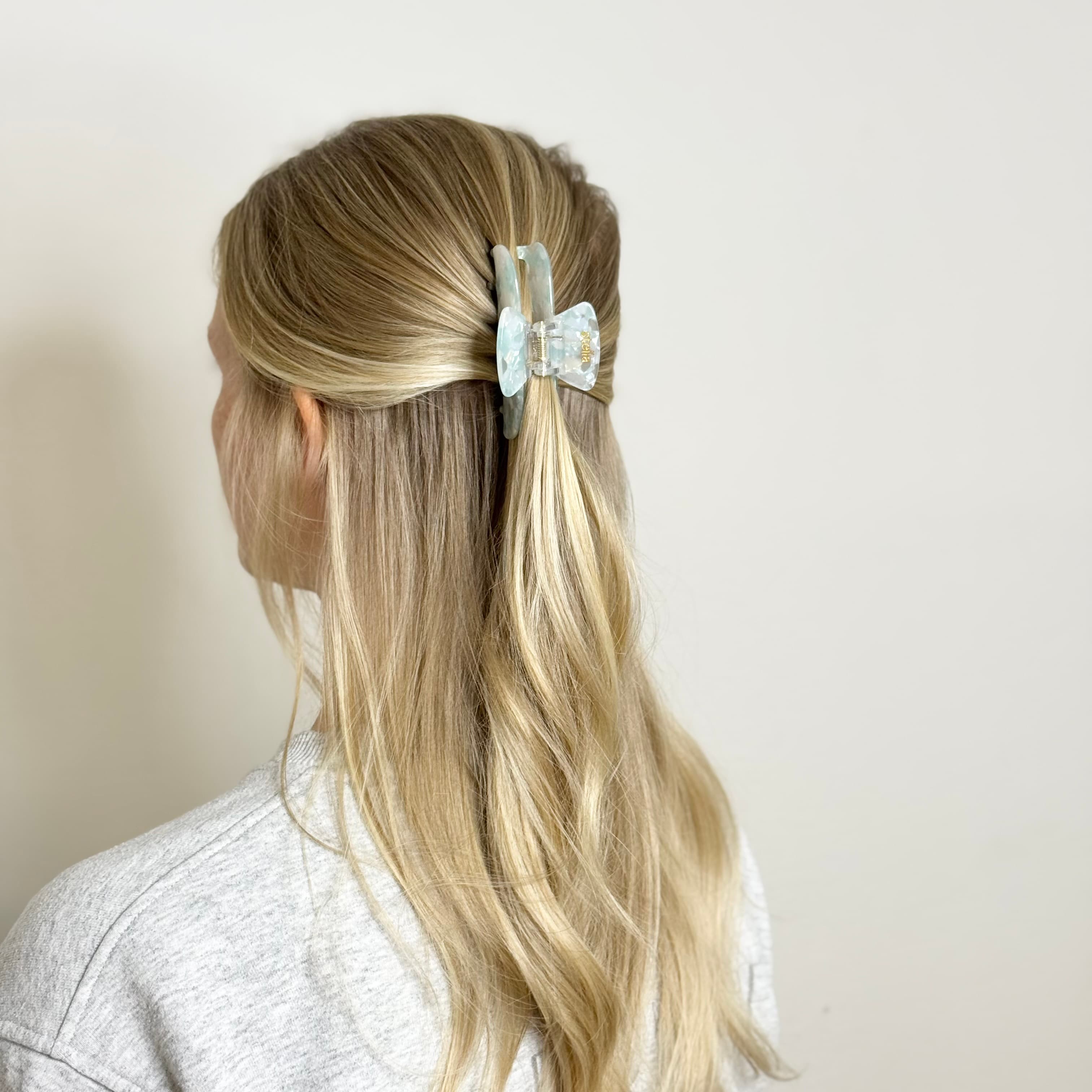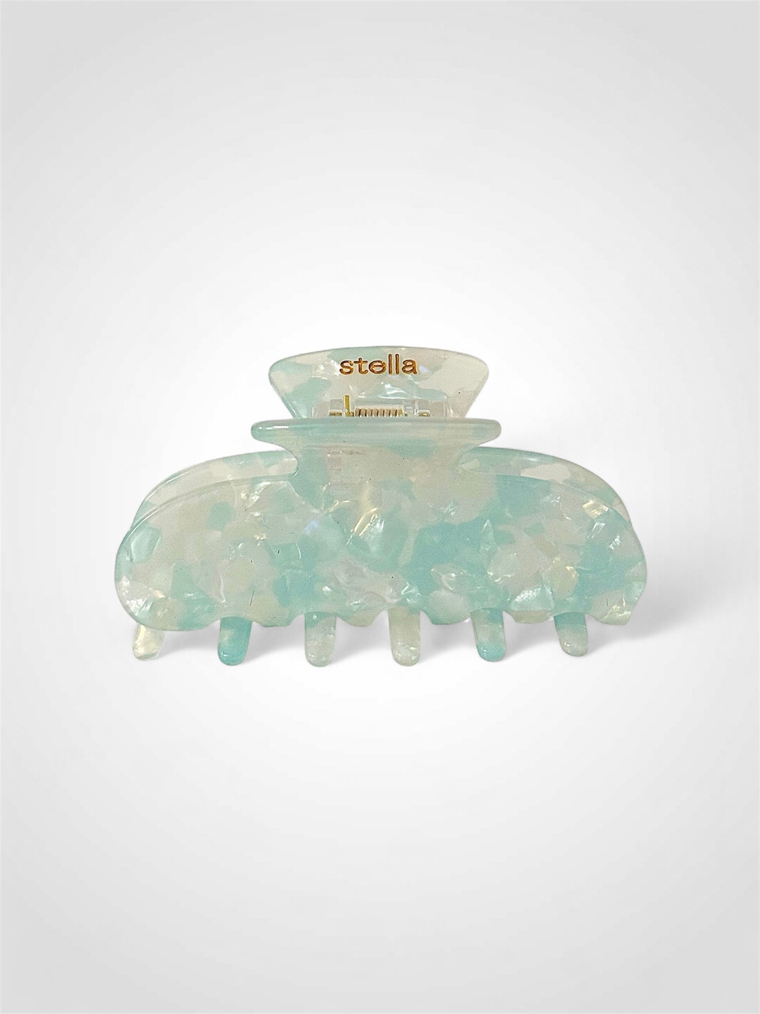 En mellanstor hårklämma i ett mintgrönt mönster med glansig finish – enkel, elegant och lätt att använda. Den klassiska formen ger ett bekvämt grepp som håller håret på plats. Storleken gör den mångsidig: perfekt för heluppsättningar i tunnare hår, eller för halvuppsättningar om du har tjockare hår.