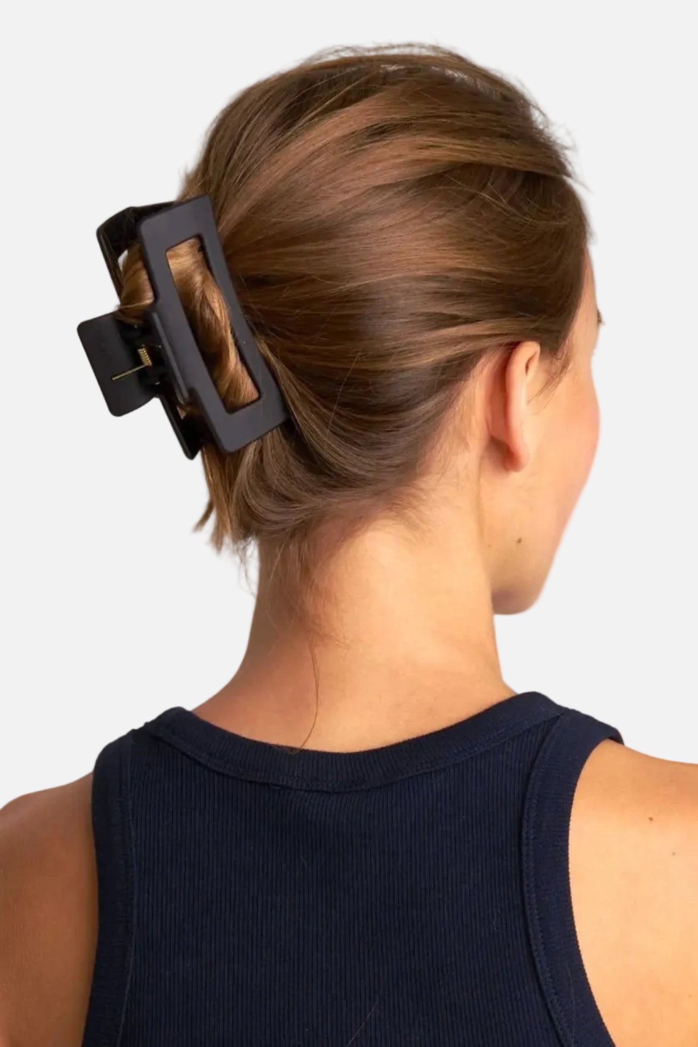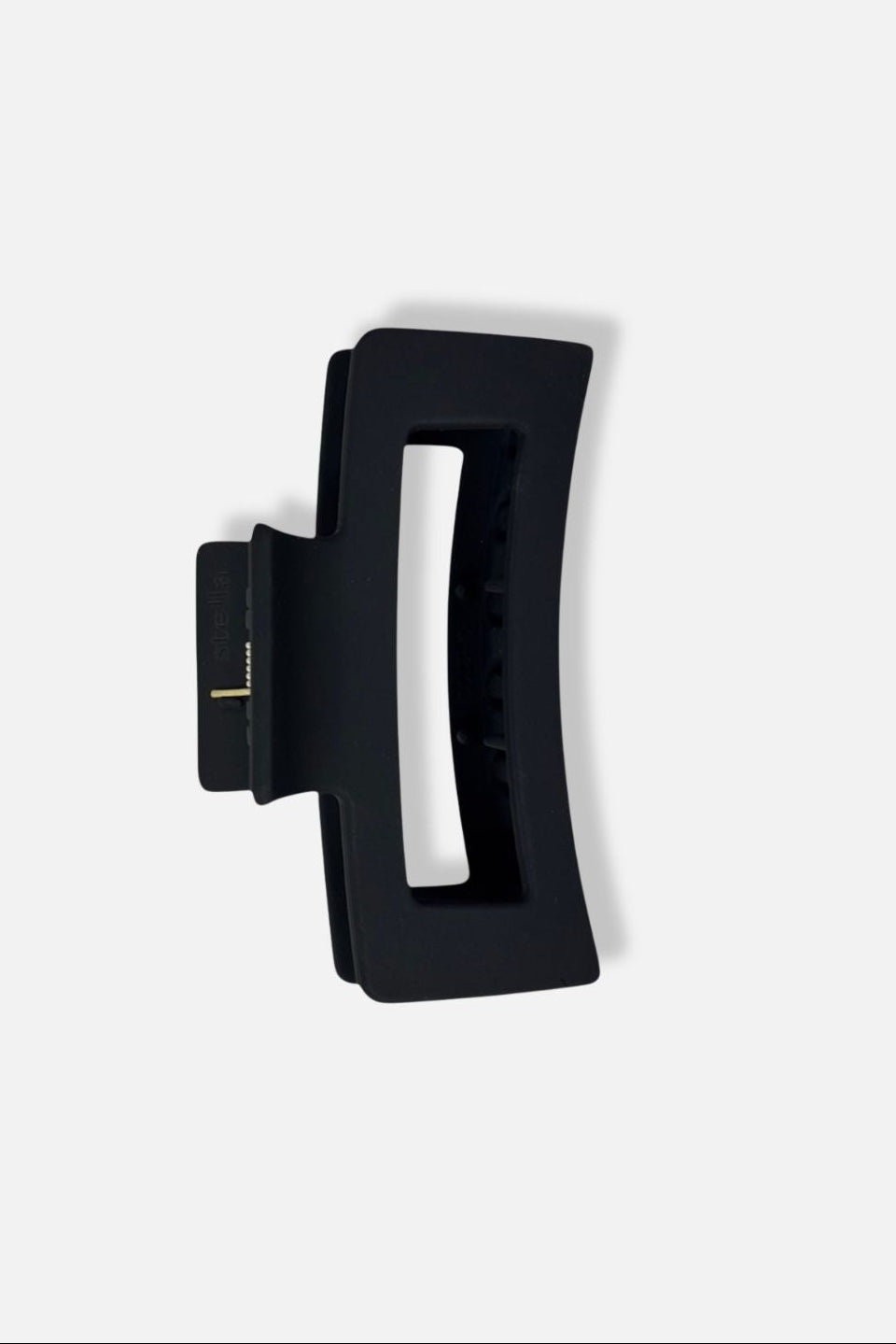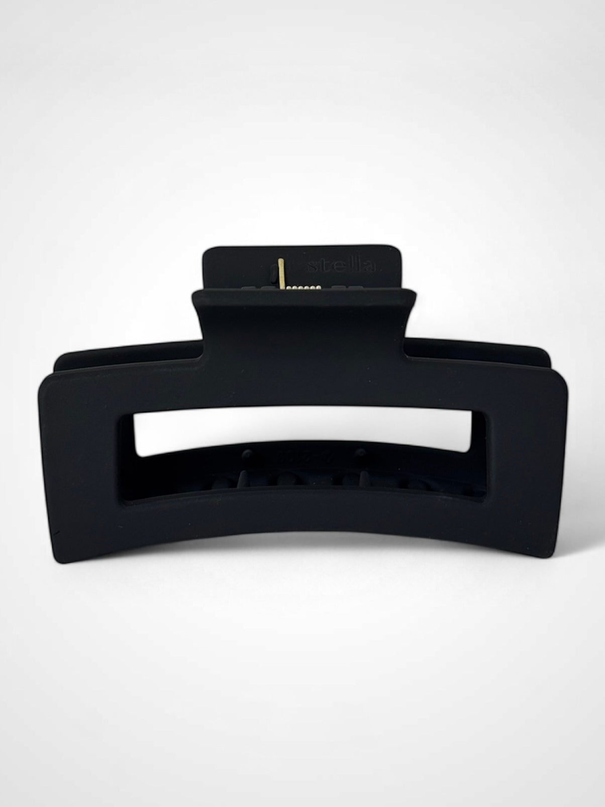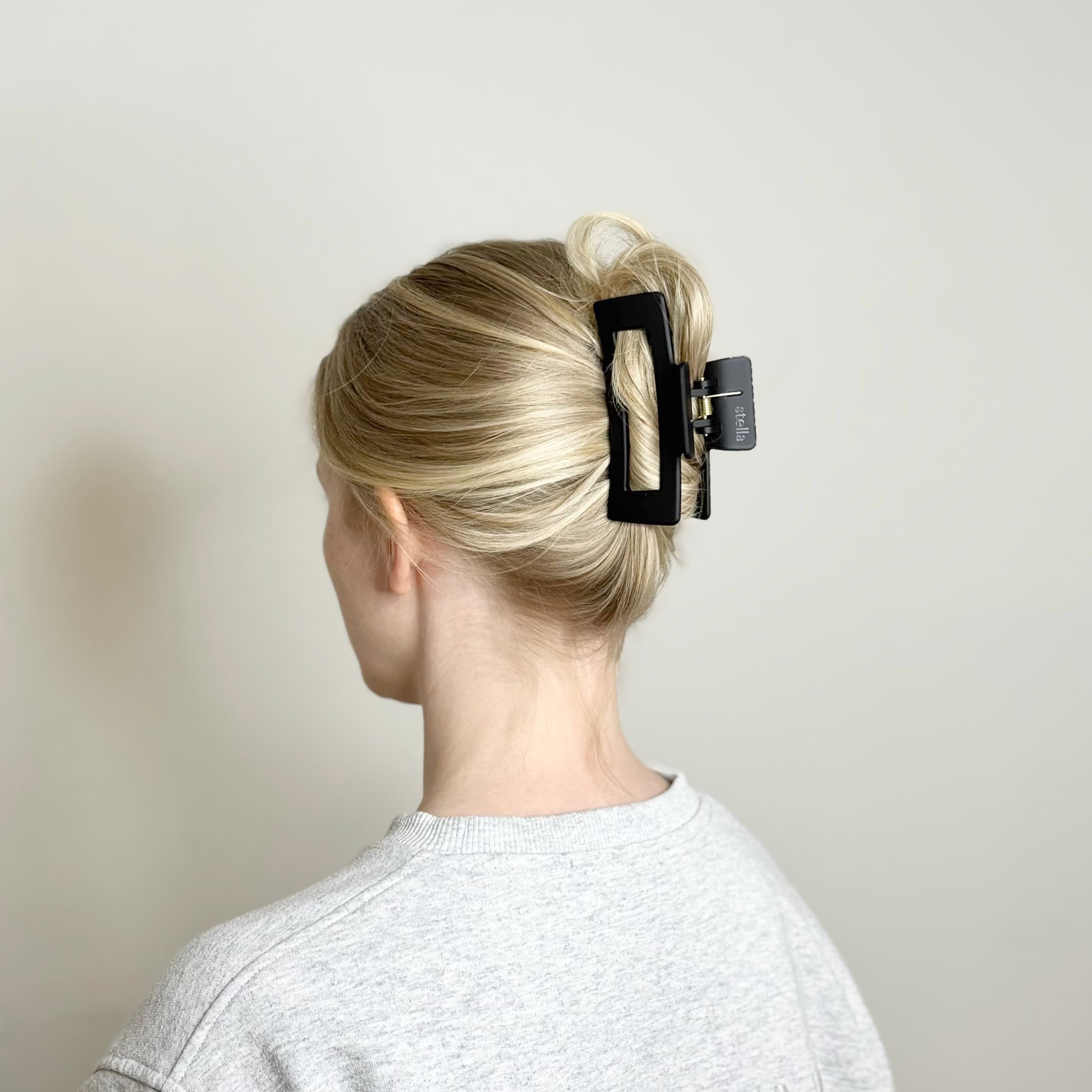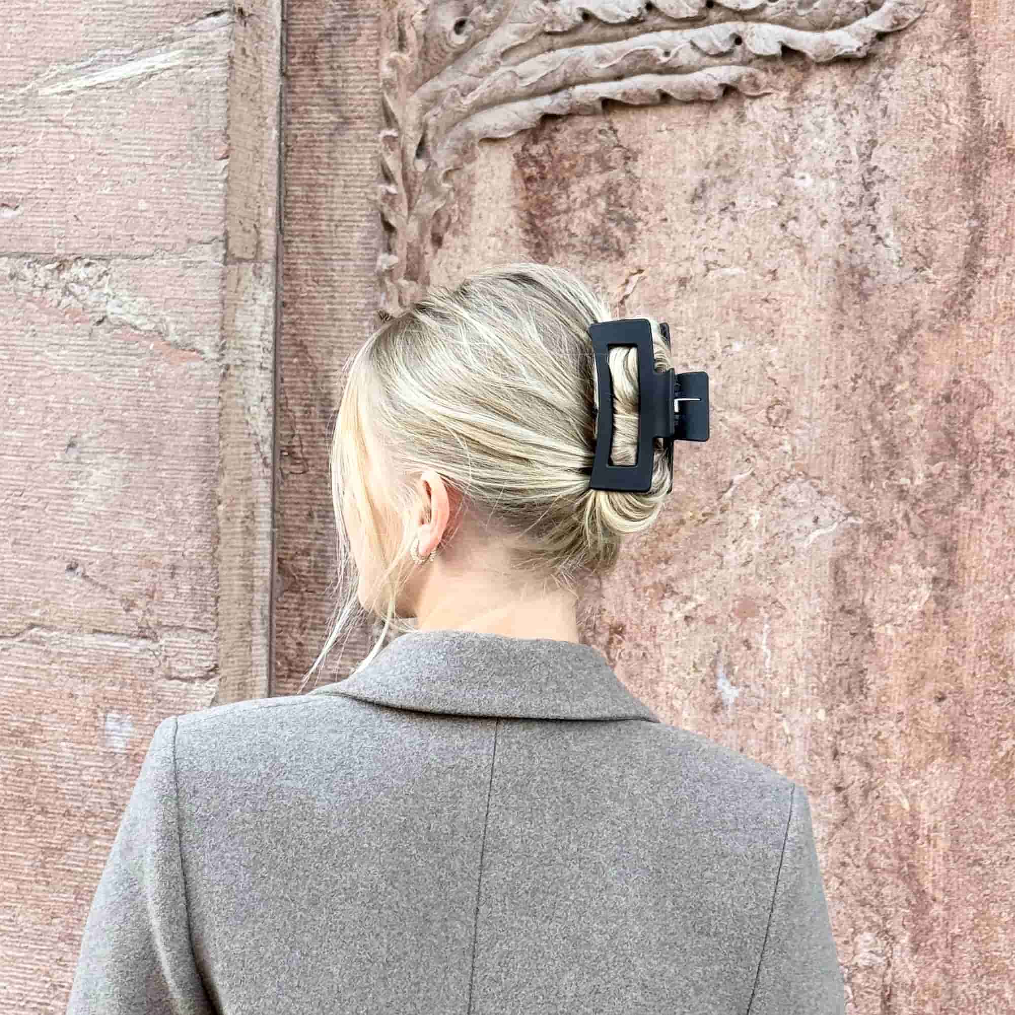 En stor svart hårklämma som verkligen håller håret på plats hela dagen. Den matta finishen och enkla formen ger ett stilrent uttryck. Men det bästa, den sitter där den ska, även i tunt, tjockt eller glatt hår tack vara dess starka grepp och de extra piggarna på insidan.