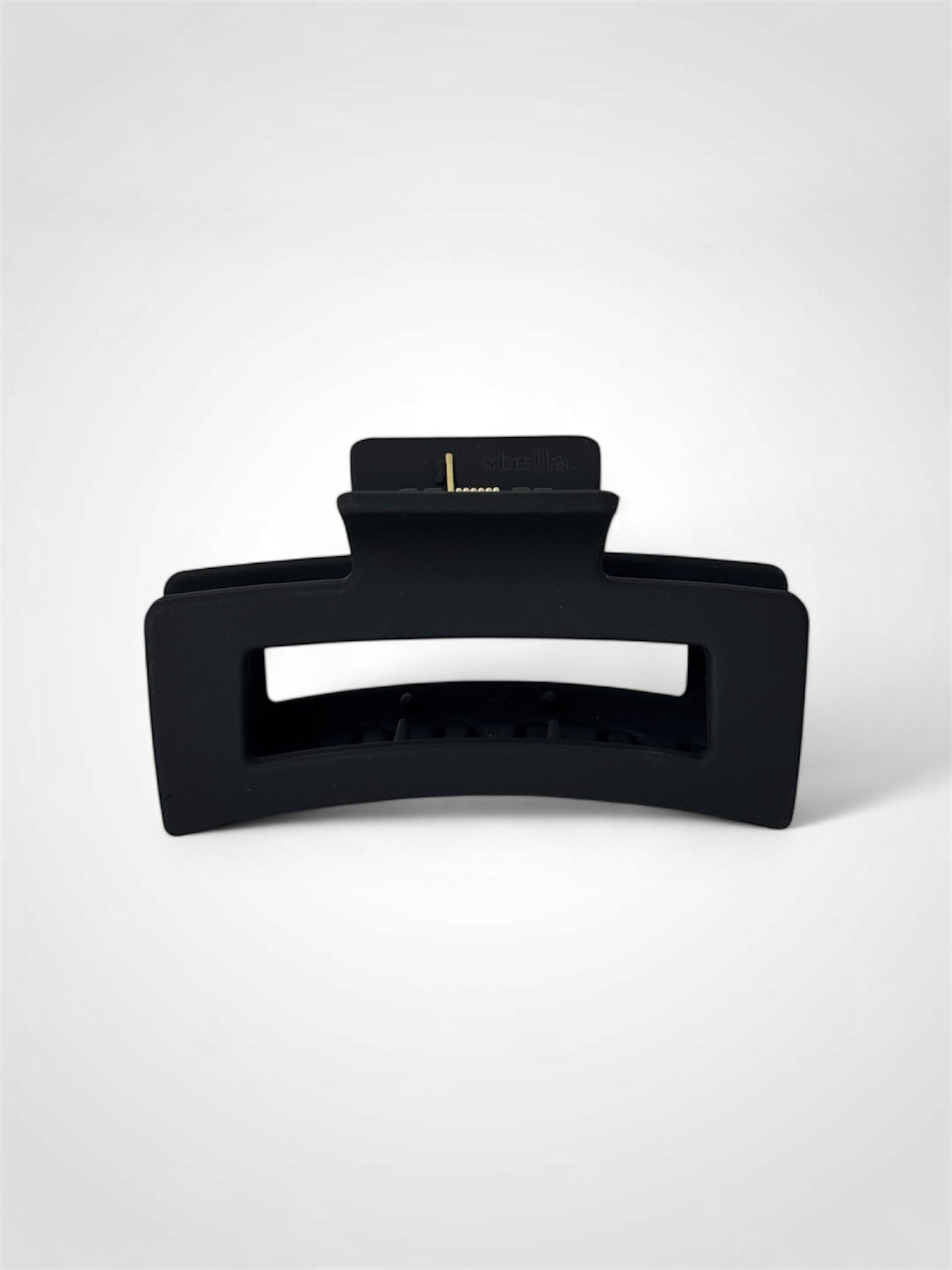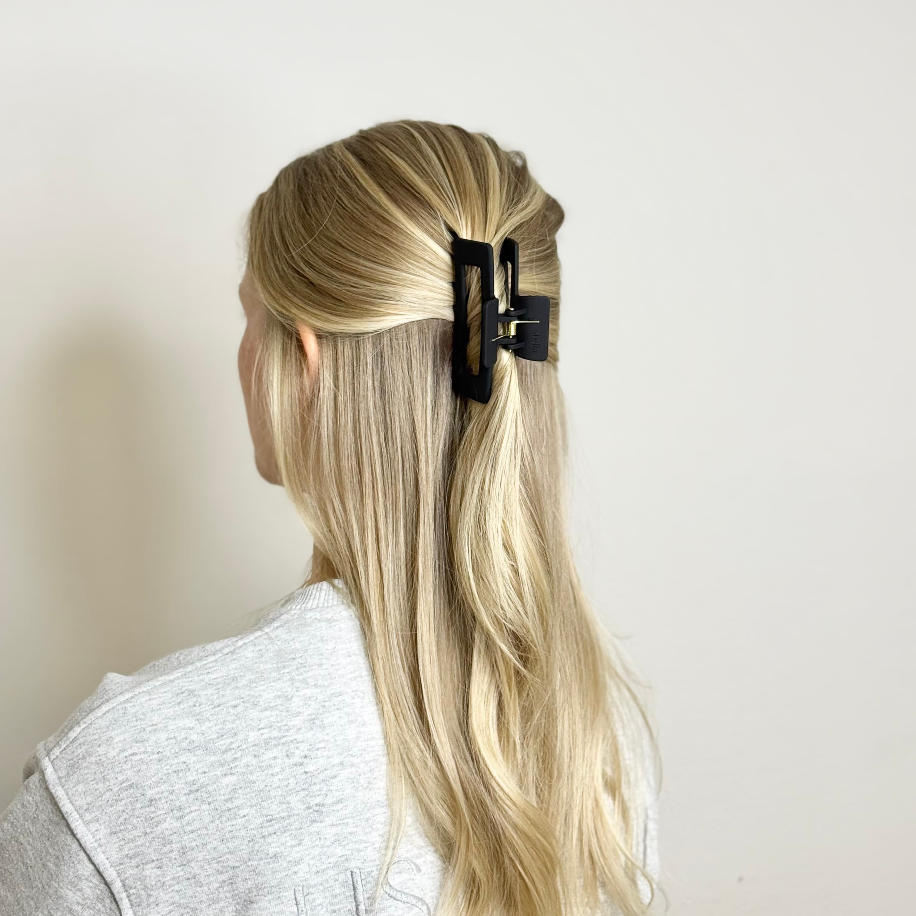 En mellanstor hårklämma med matt svart finish – enkel, stilren och skapad för att sitta riktigt stadigt. Den klassiska formen tillsammans med de små piggarna på insidan ger ett extra bra grepp som håller håret på plats hela dagen.