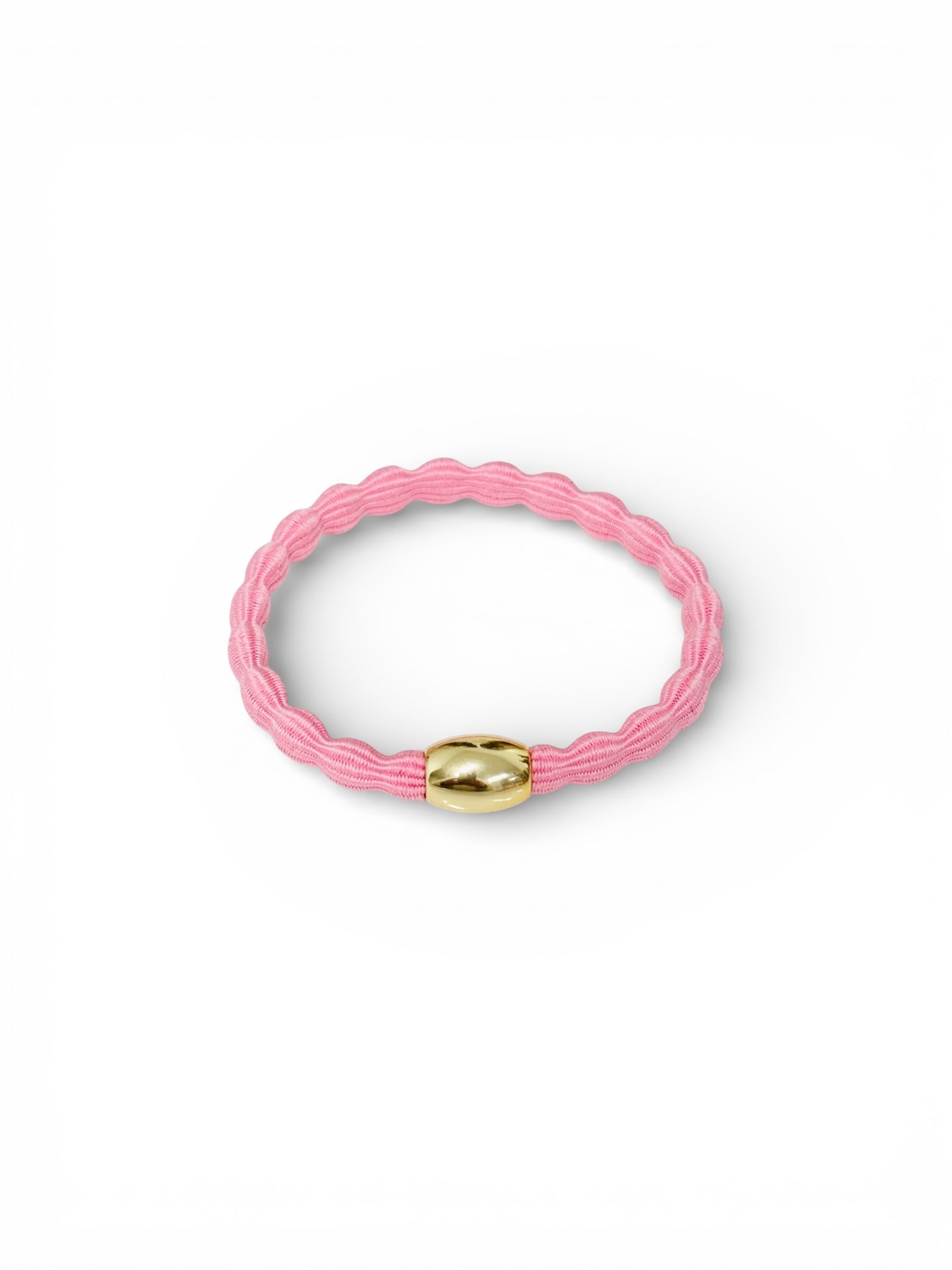 Rosa bubblig hårsnodd med guldpärla.