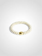 En cremévit hårsnodd med guldfärgad pärla som har riktigt bra kvalitet och hög elasticitet. Denna hårsnodd är både snygg i håret och runt handleden.