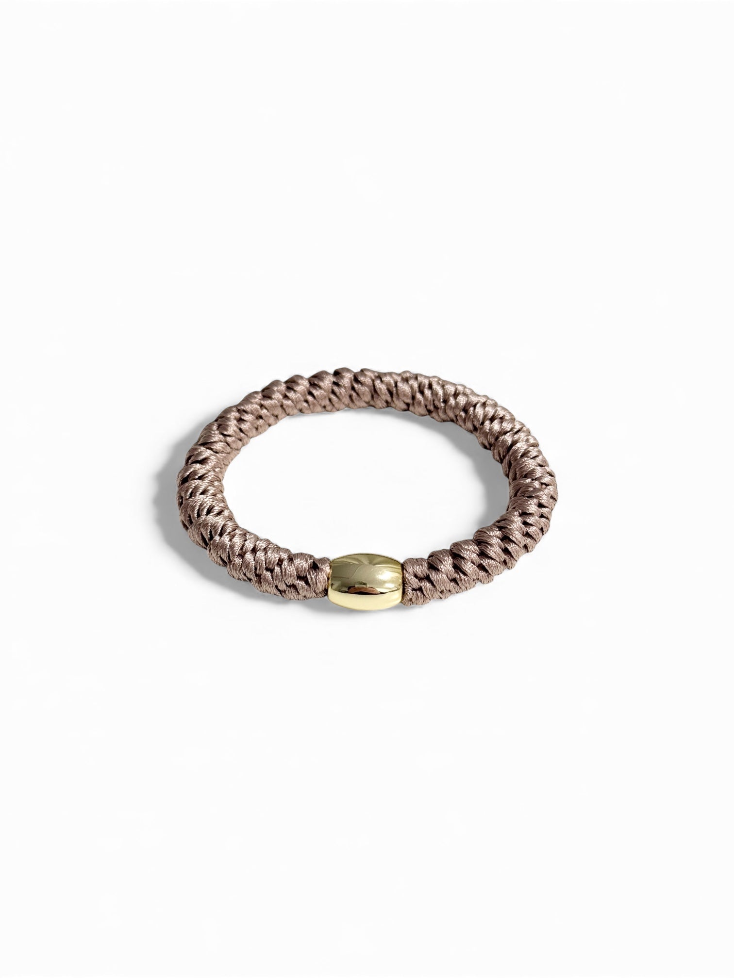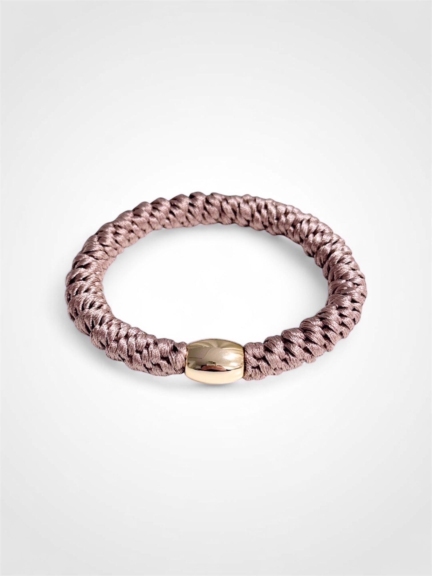 Dusty pink hårsnodd med guldfärgad pärla som har riktigt bra kvalitet och hög elasticitet. Denna hårsnodd är både snygg i håret och runt handleden.