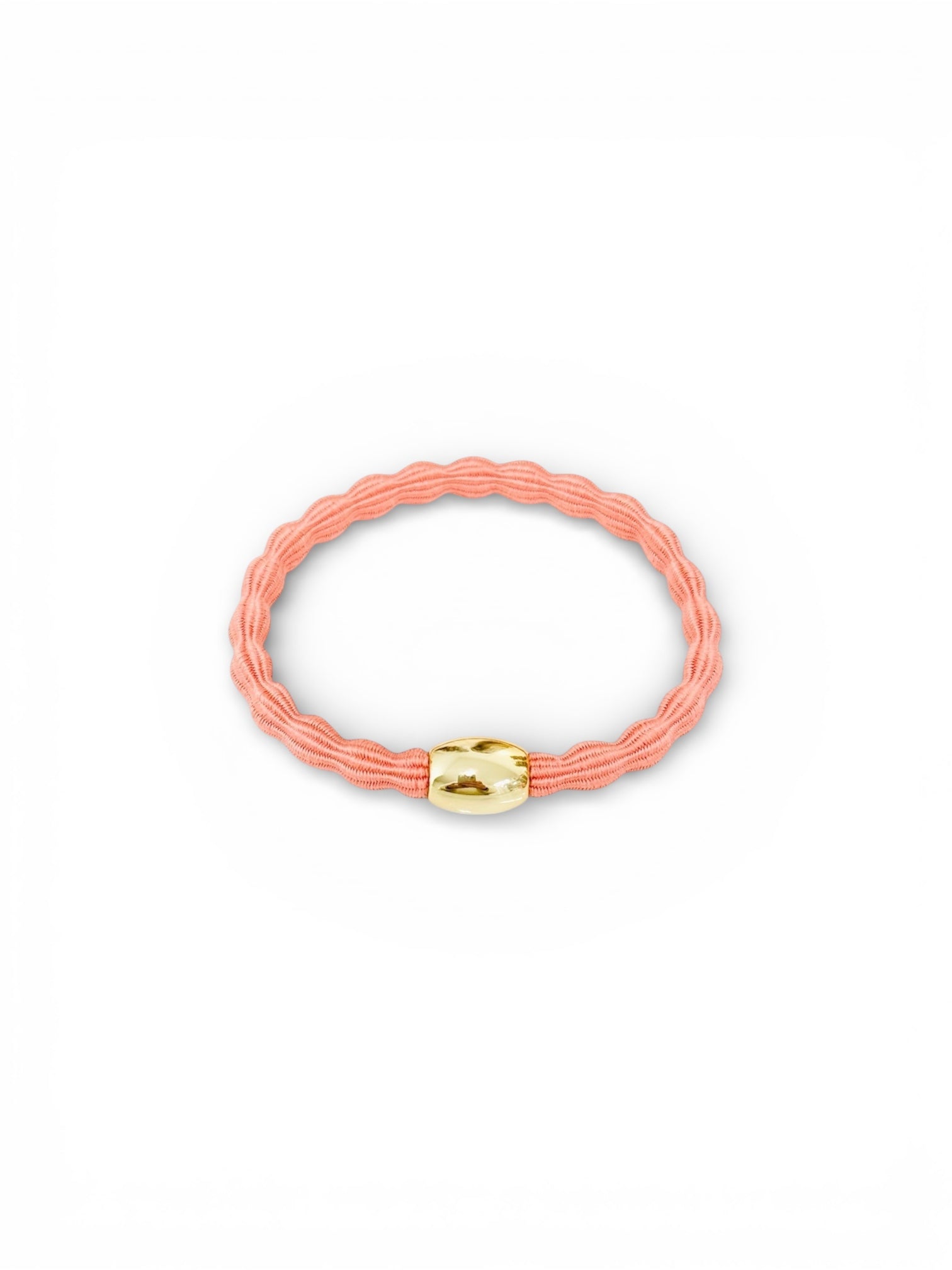 Korallfärgad bubblig hårsnodd med guldpärla.