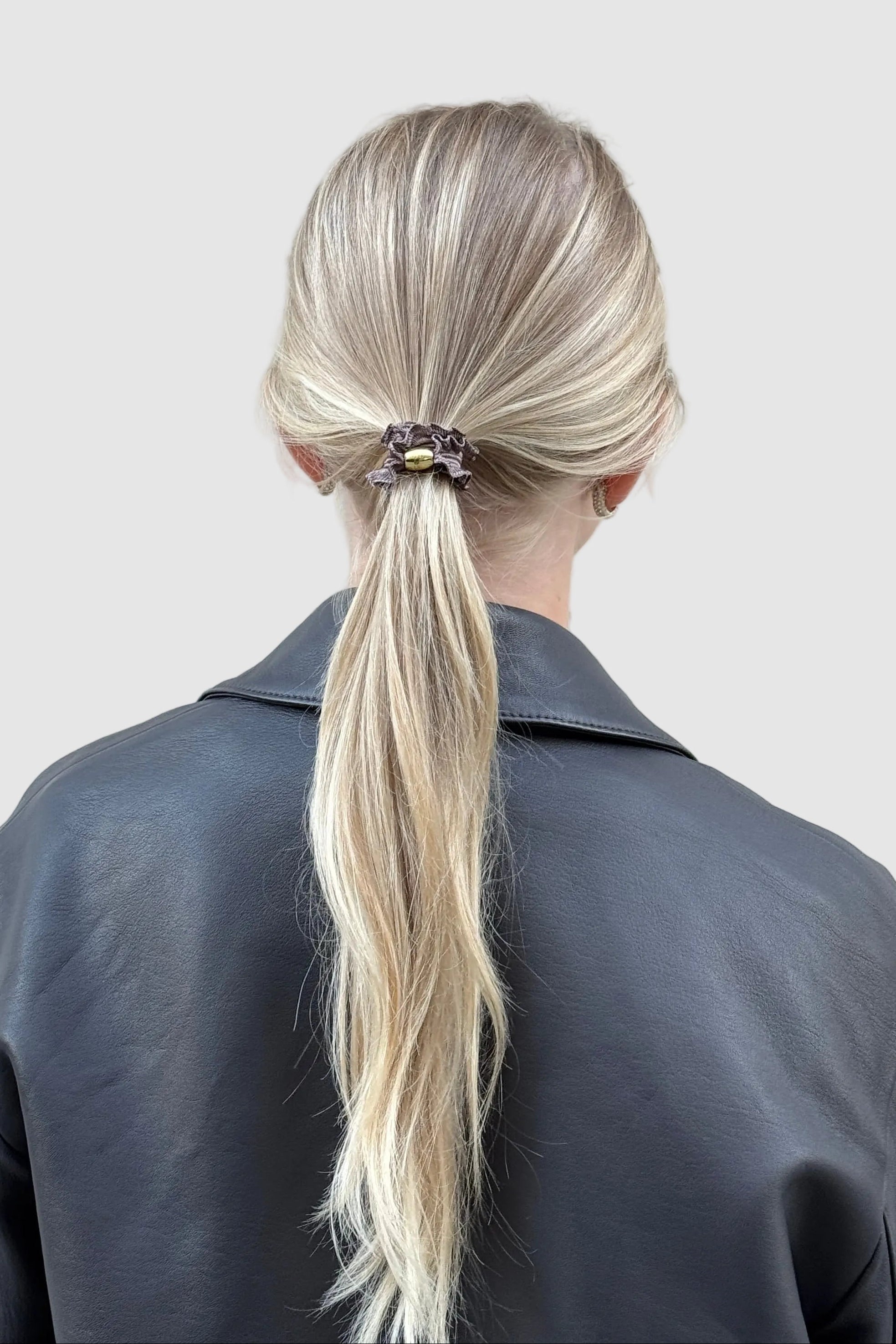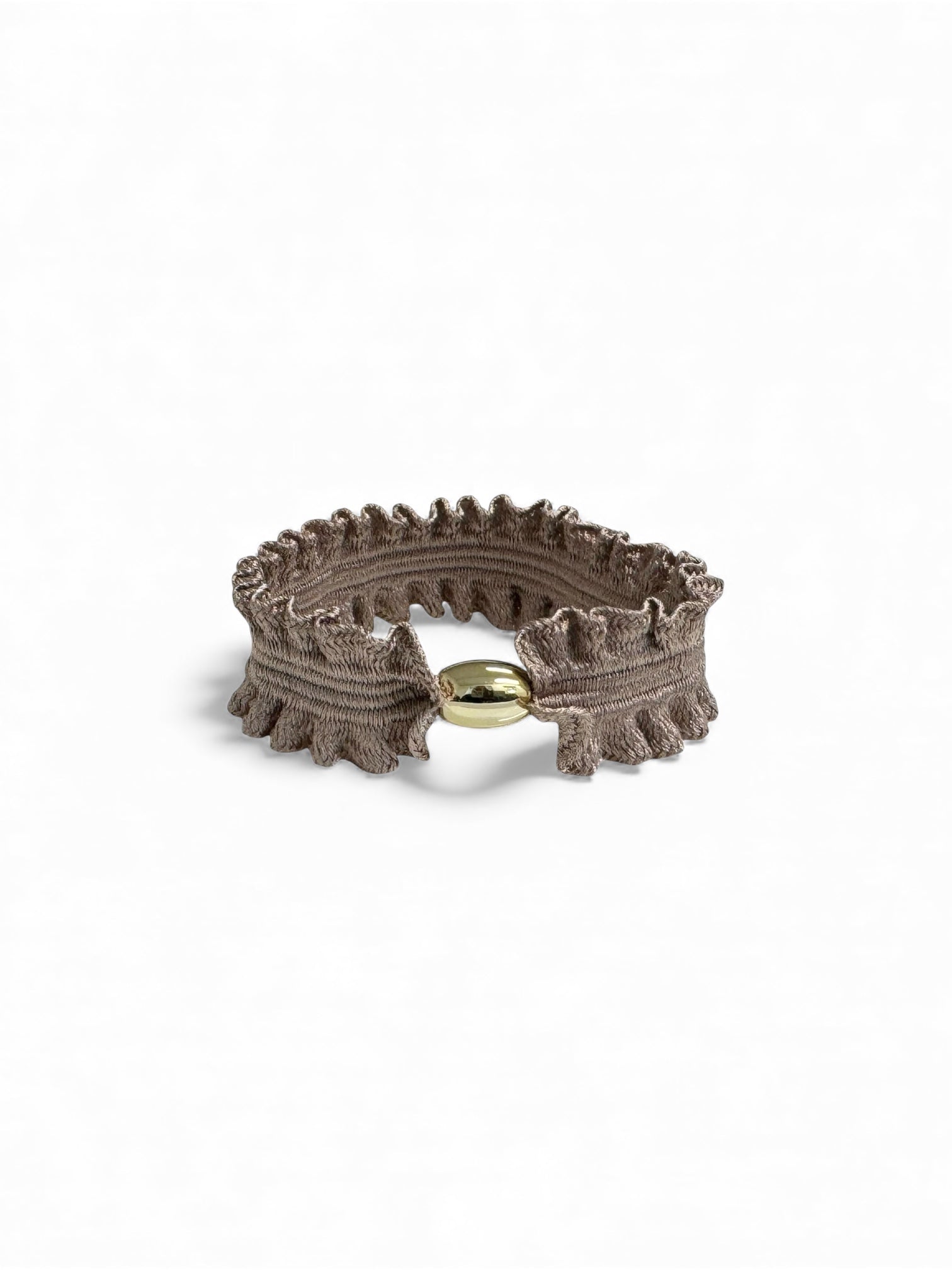 En brun hårsnodd med mjuk volang och en guldfärgad pärla, fin både i håret och runt handleden. Den perfekta lilla detaljen när du vill sätta upp håret med något som känns både praktiskt och personligt.