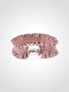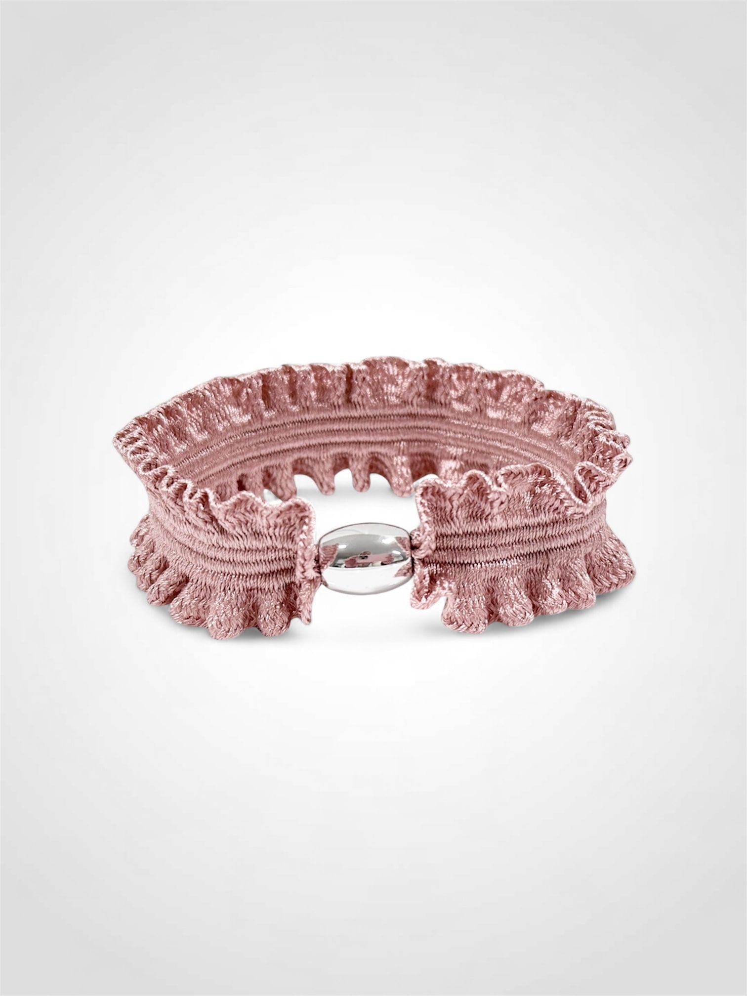 En rosa hårsnodd med mjuk volang och en silverfärgad pärla – fin både i håret och runt handleden. Den perfekta lilla detaljen när du vill sätta upp håret med något som känns både praktiskt och personligt.