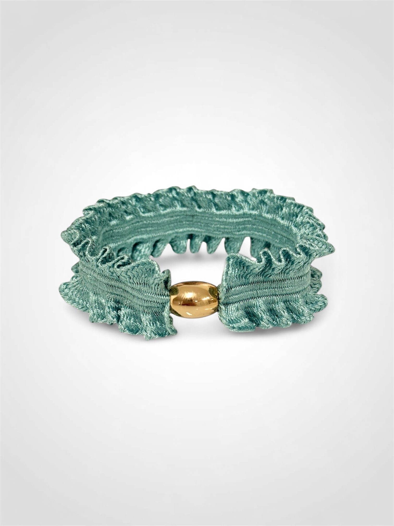 En turkosgrön hårsnodd med mjuk volang och en guldfärgad pärla – fin både i håret och runt handleden. Den perfekta lilla detaljen när du vill sätta upp håret med något som känns både praktiskt och personligt.