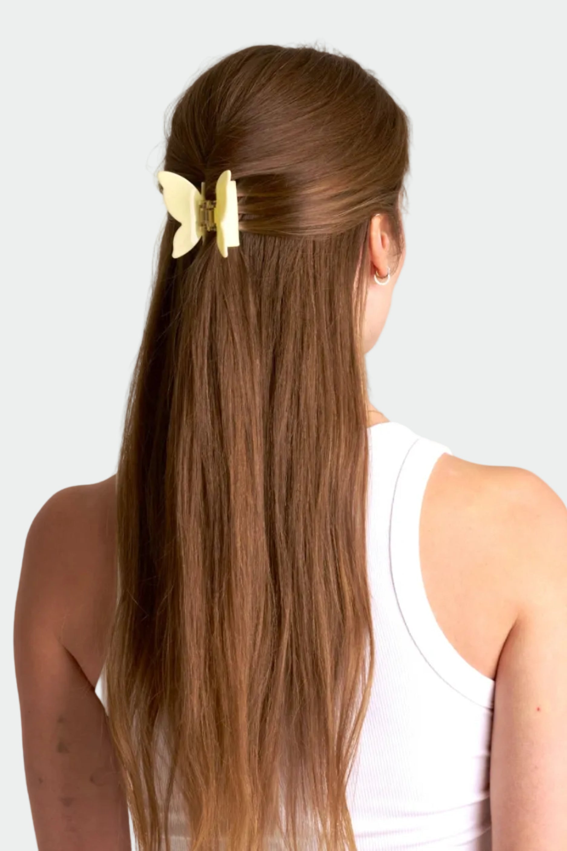 Du vet när håret bara måste upp – men du vill ändå känna dig lite fin. Den här ljusgula hårklämman är precis för de stunderna. Formad som en fjäril, men gjord för att hålla ihop en snabb och enkel uppsättning.