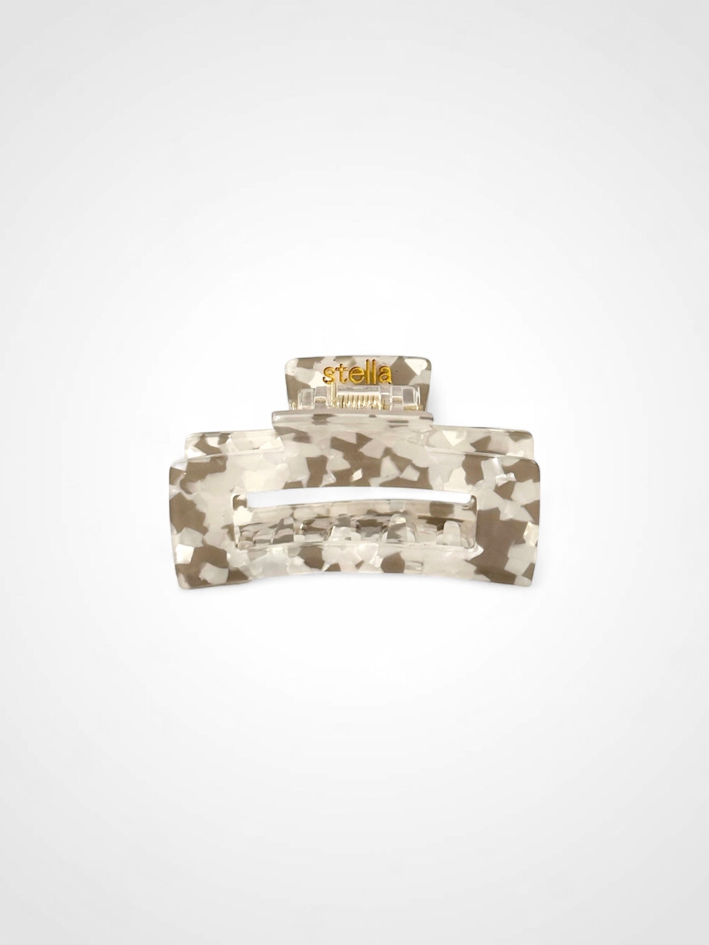 En liten hårklämma med glansig finish i en grå nyans – stilren, smidig och enkel att använda. Perfekt för halvuppsättningar eller för att samla mindre sektioner av håret på ett snabbt och fint sätt.