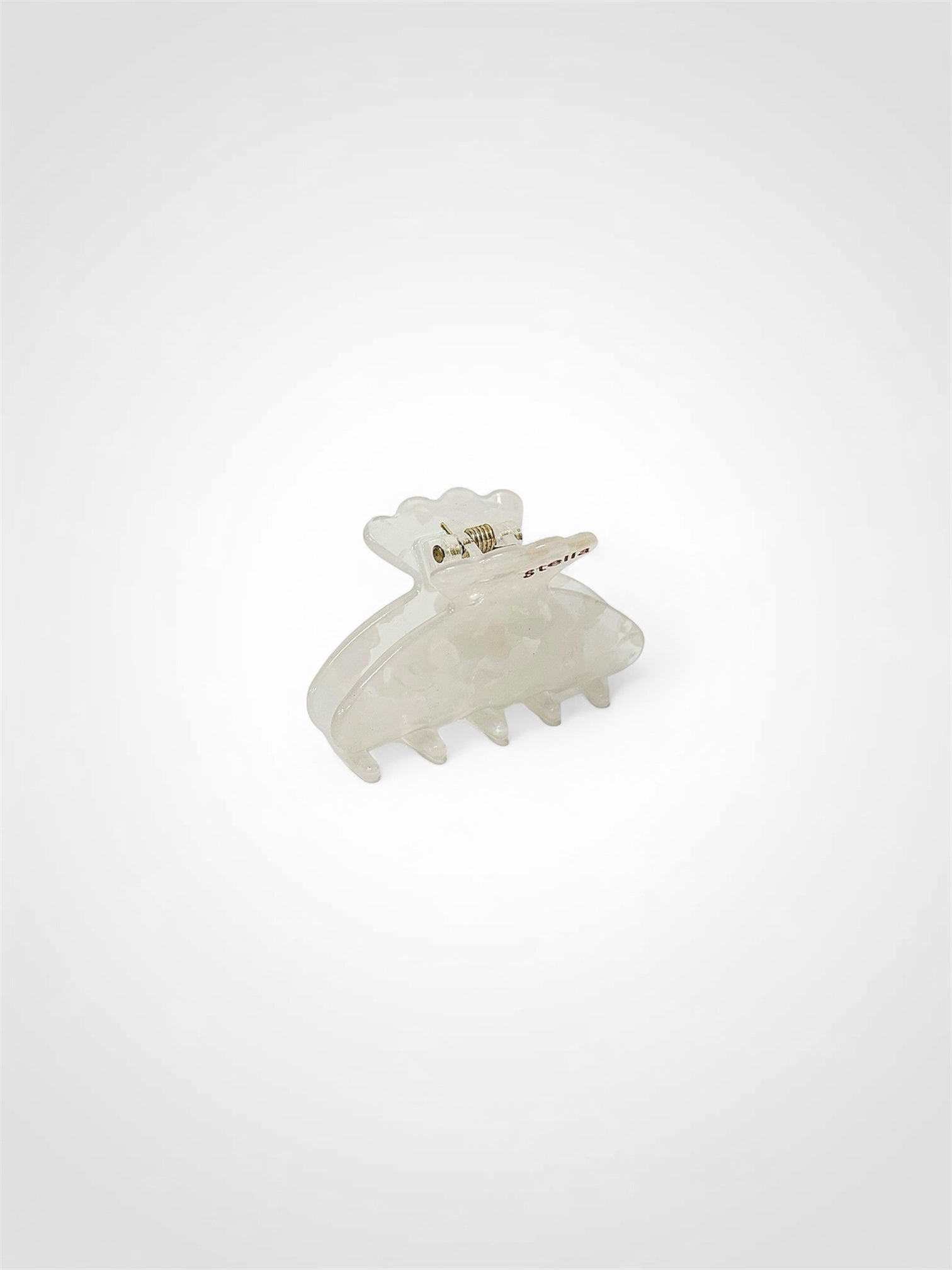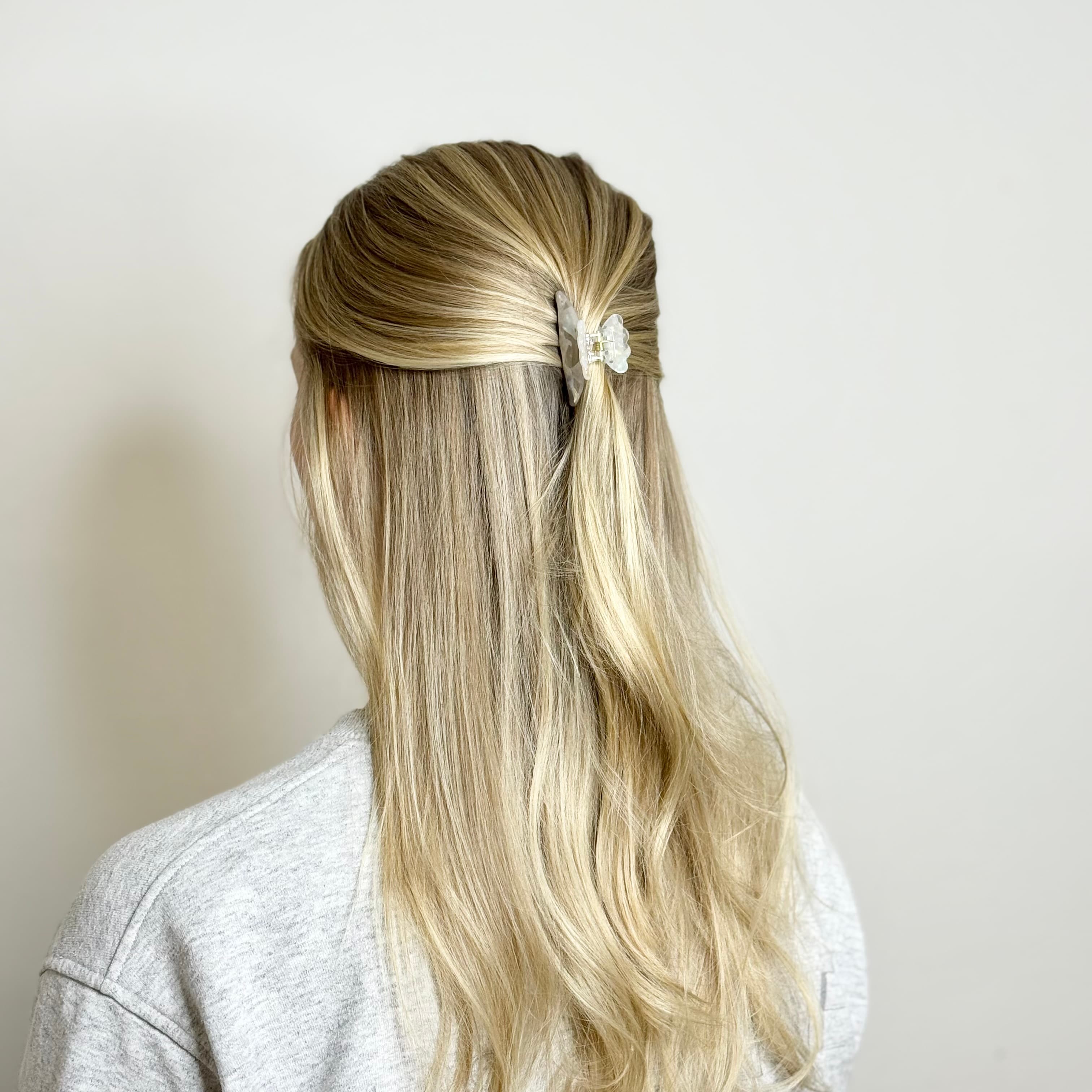 Du vet den där lilla vita klämman man alltid vill ha nära? Den som räddar morgnar när håret lever sitt eget liv – och gör en helt vanlig tisdag lite finare. Här är just en sån – en liten vit hårklämma, perfekt för en enkel halvuppsättning.