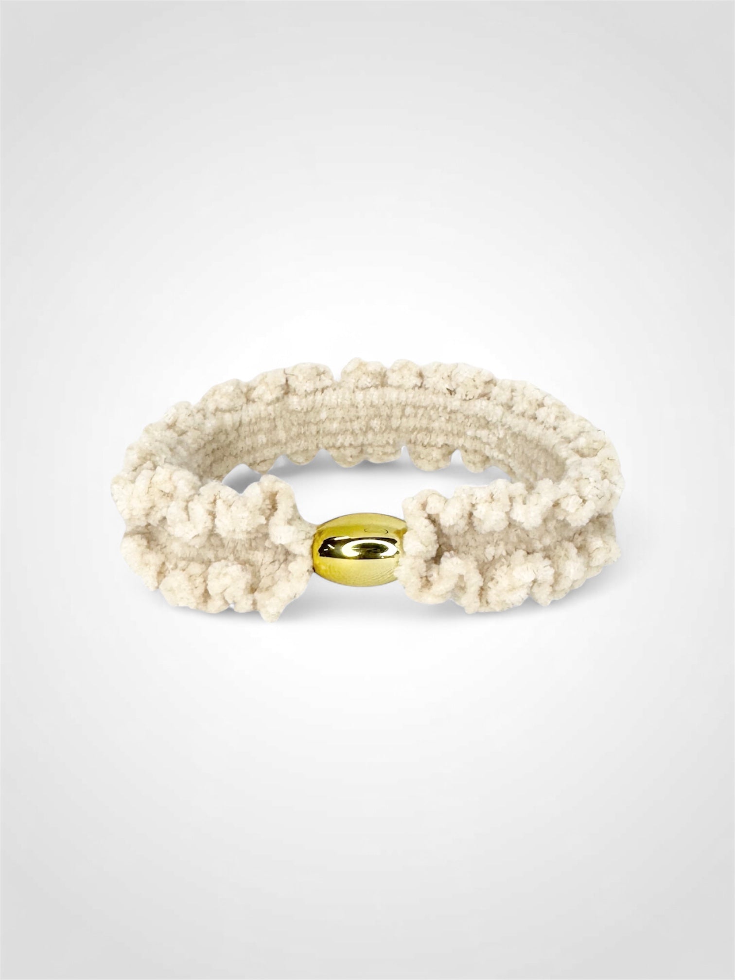 En vit hårsnodd med mjuk volang och en guldfärgad pärla – fin både i håret och runt handleden. Den perfekta lilla detaljen när du vill sätta upp håret med något som känns både praktiskt och personligt.