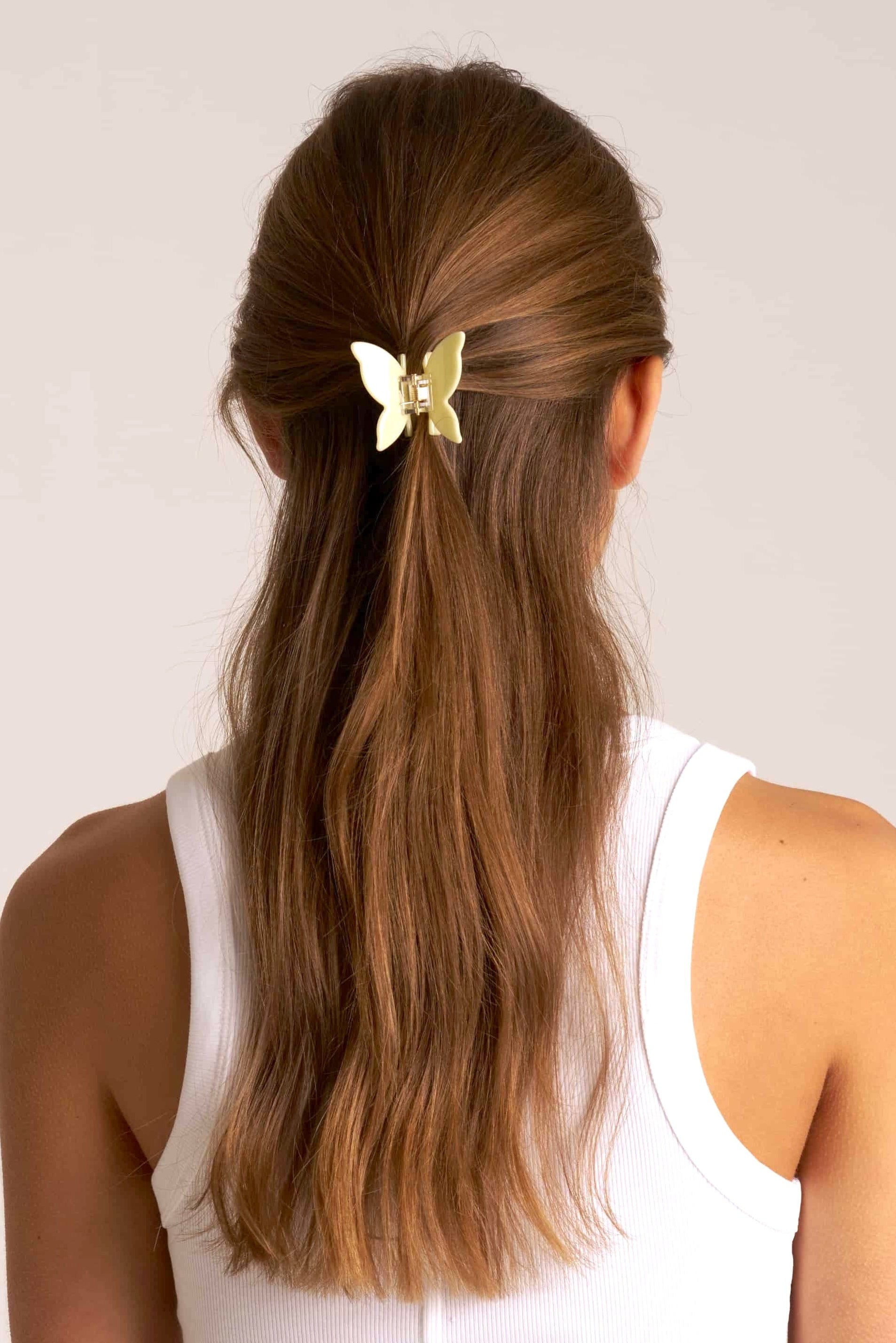Du vet när håret bara måste upp – men du vill ändå känna dig lite fin. Den här citrongula hårklämman är precis för de stunderna. Formad som en fjäril, gjord för att hålla ihop en snabb och enkel uppsättning.