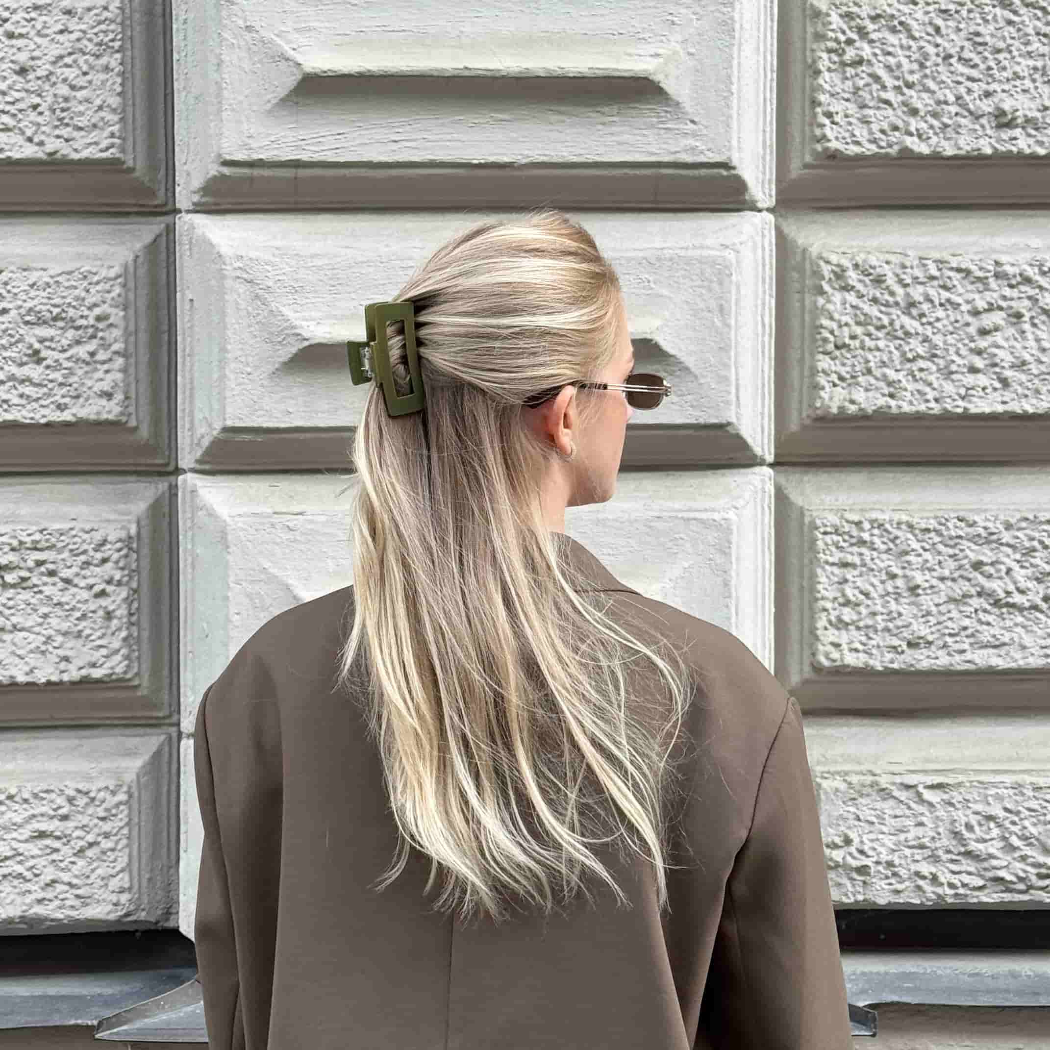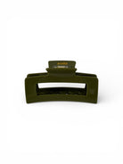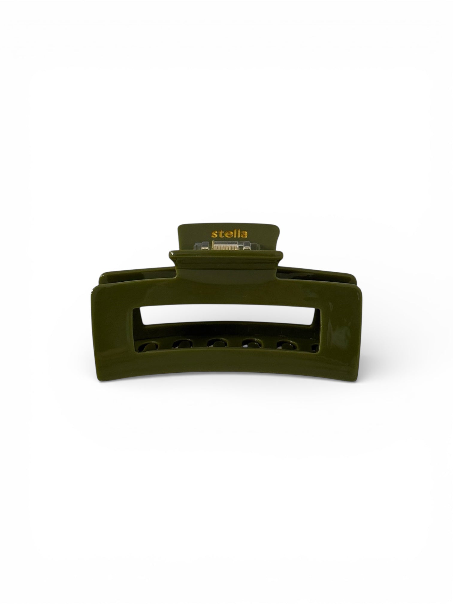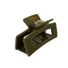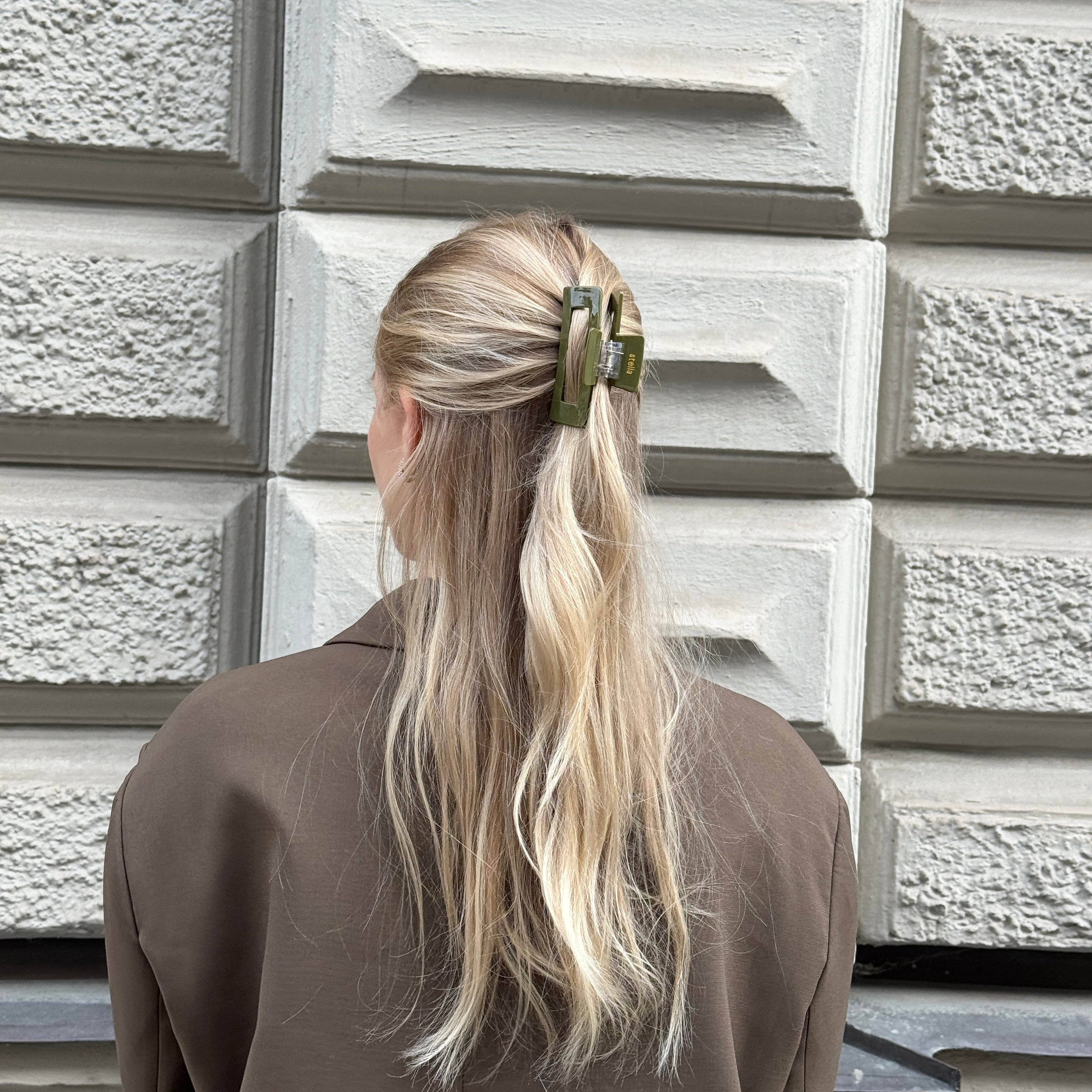 En mellanstor olivgrön hårklämma – enkel, elegant och lätt att använda. Den klassiska formen ger ett bekvämt grepp som håller håret på plats.