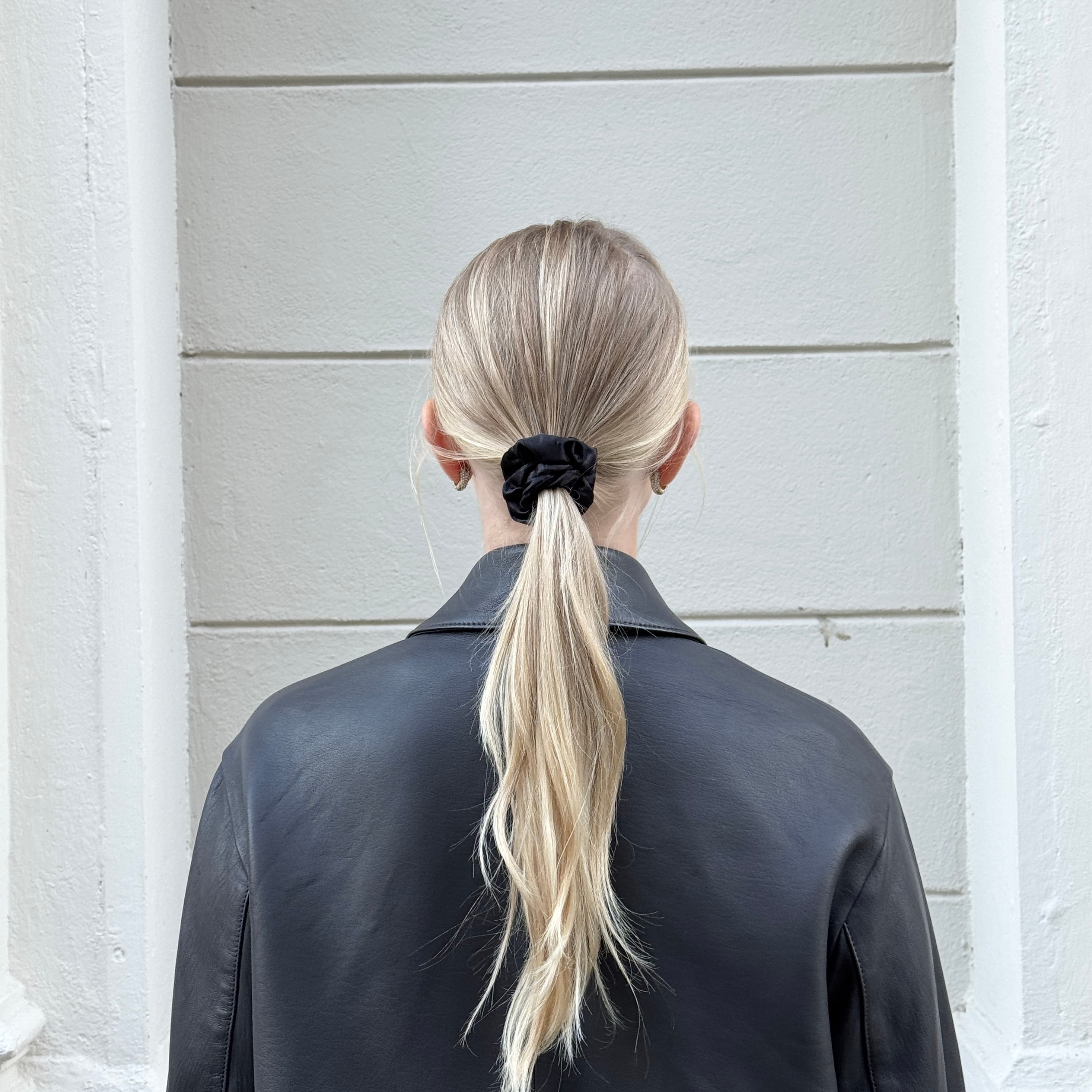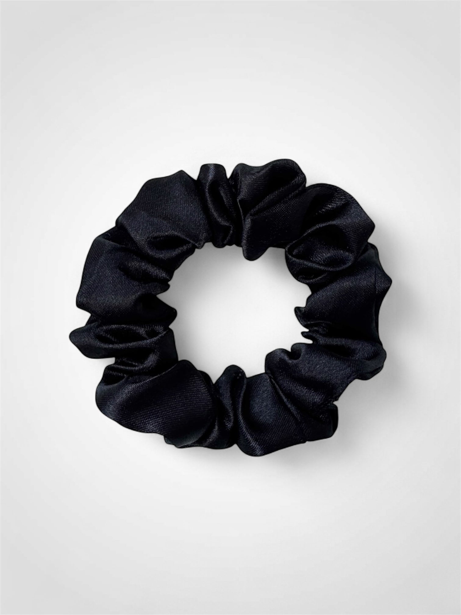 En klassisk svart scrunchie i satin som passar till allt. Den mjuka satinen är skonsam mot håret och håller uppsättningen på plats utan att slita.