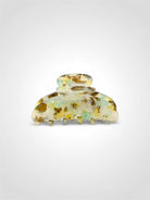 En grönmönstrad hårklämma från Stella Details. Klämman är 7 cm lång och passar framförallt halvuppsättningar.