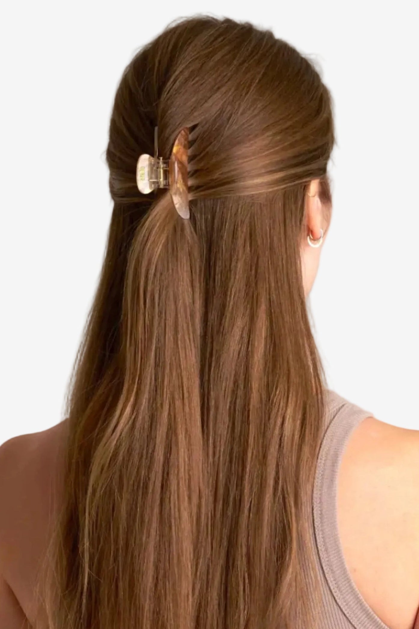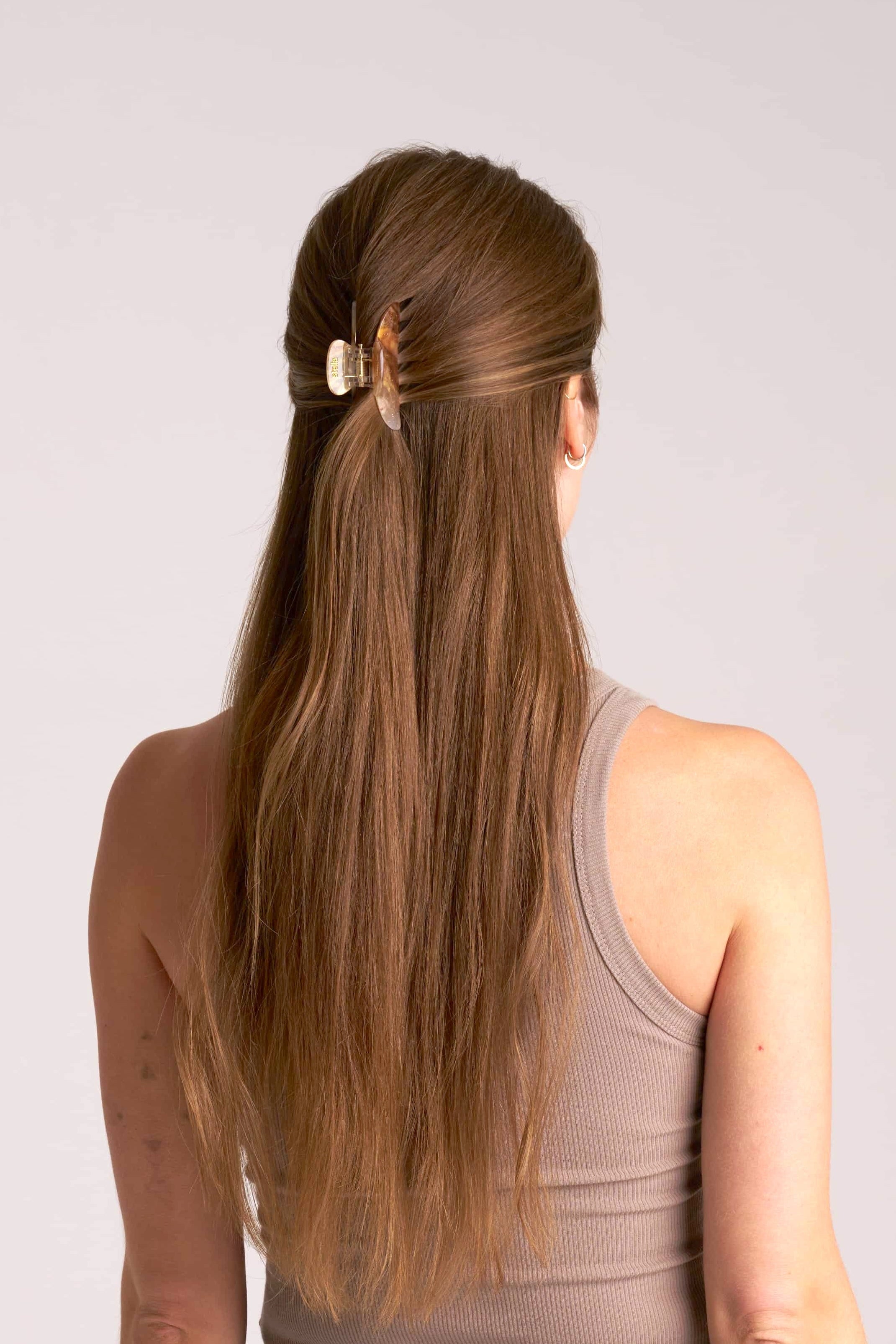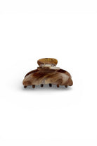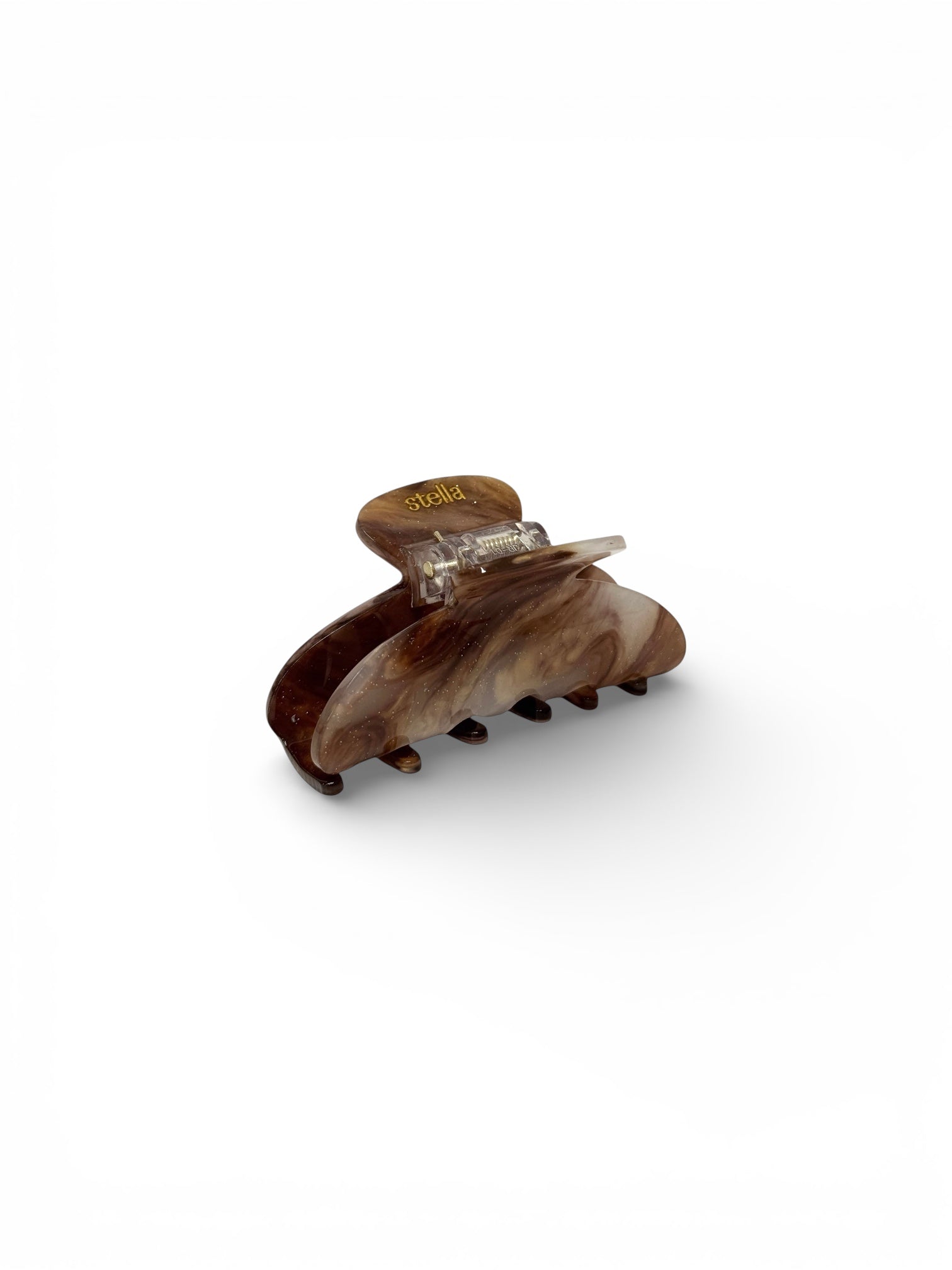 En cappuccinomönstrad hårklämma från Stella Details. Klämman är 7 cm lång och passar framförallt halvuppsättningar.