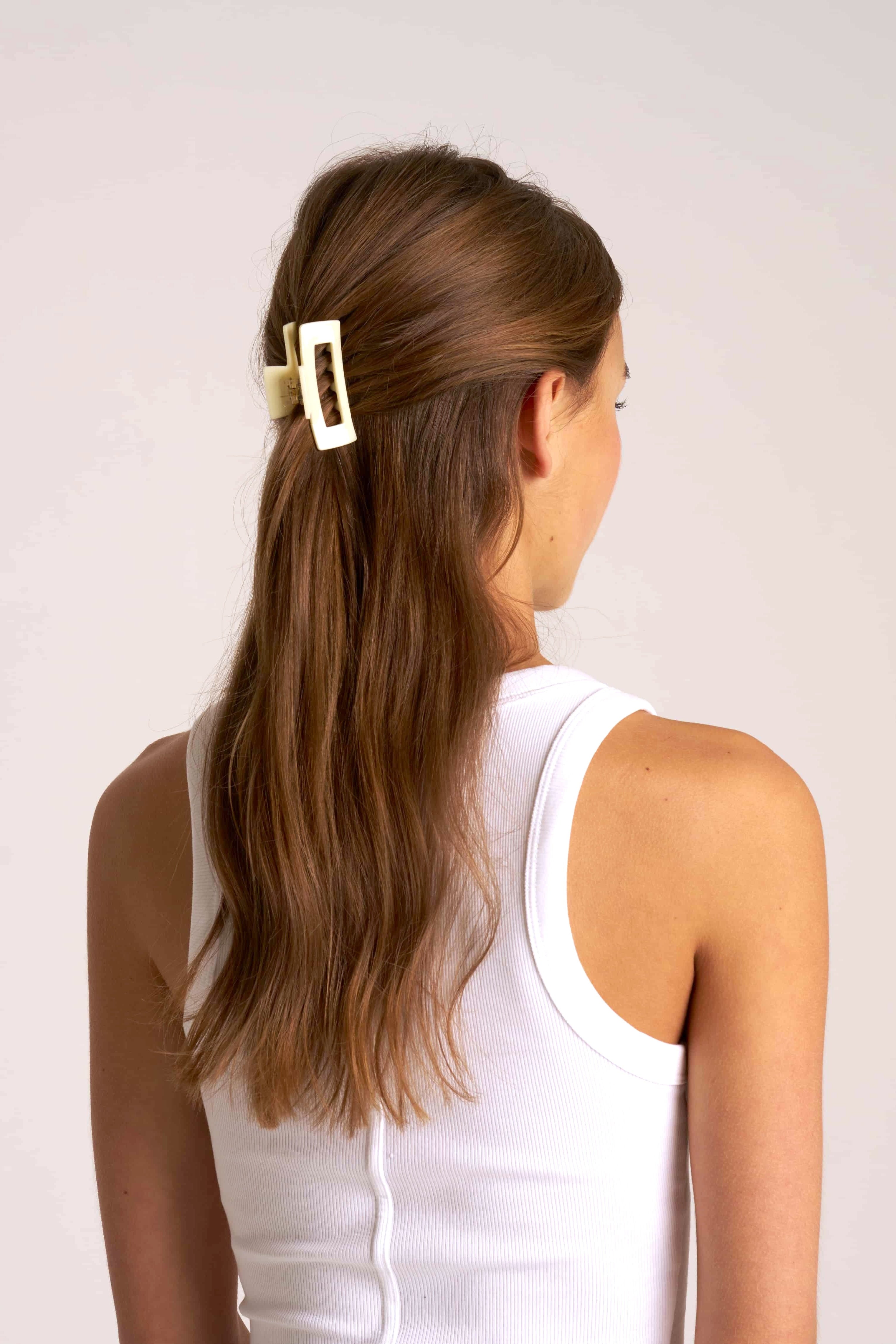En liten hårklämma med glansig finish. Stilren, smidig och enkel att använda. Perfekt för halvuppsättningar eller för att samla mindre sektioner av håret på ett snabbt och fint sätt.