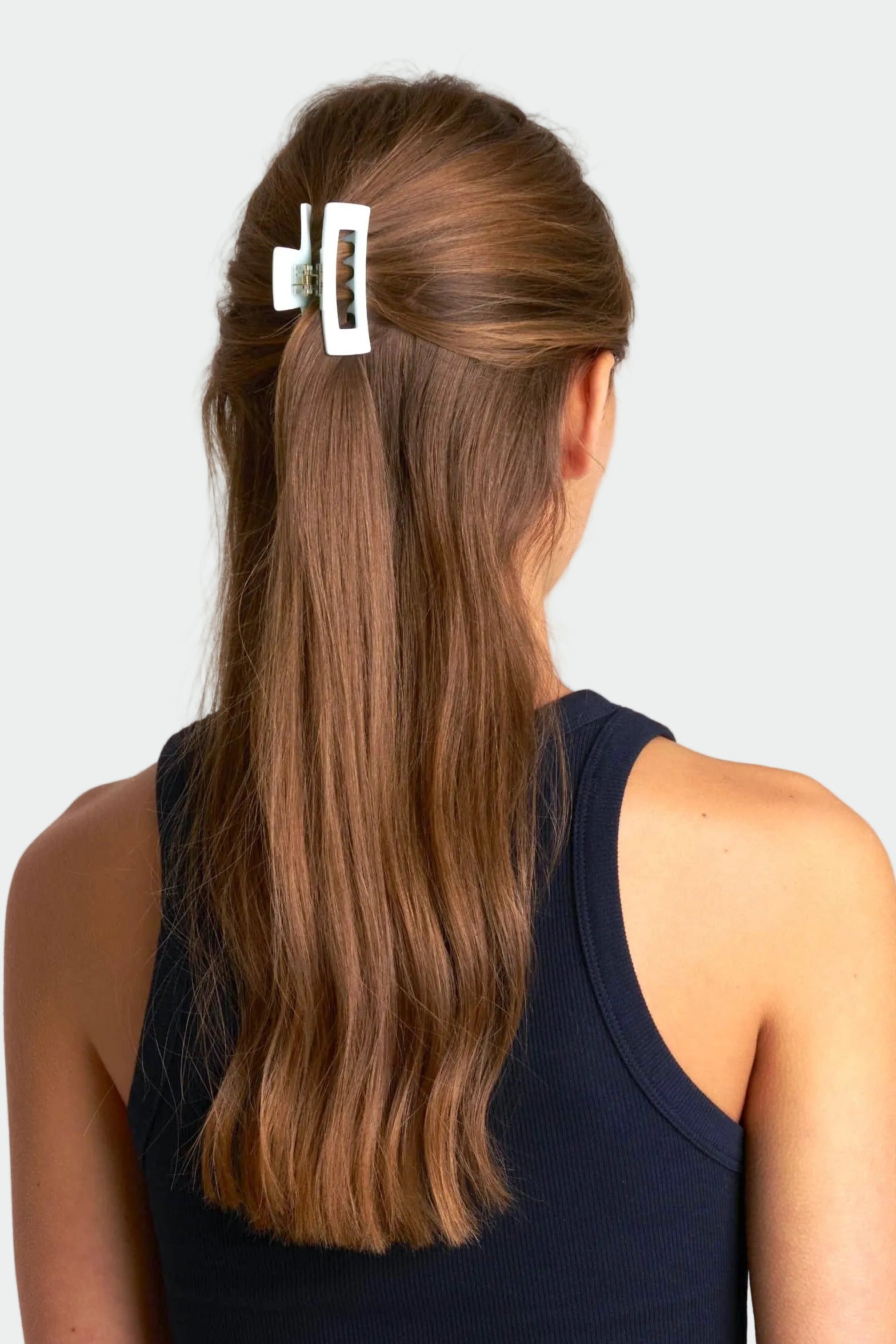 En liten hårklämma med glansig finish. Stilren, smidig och enkel att använda. Perfekt för halvuppsättningar eller för att samla mindre sektioner av håret på ett snabbt och fint sätt.