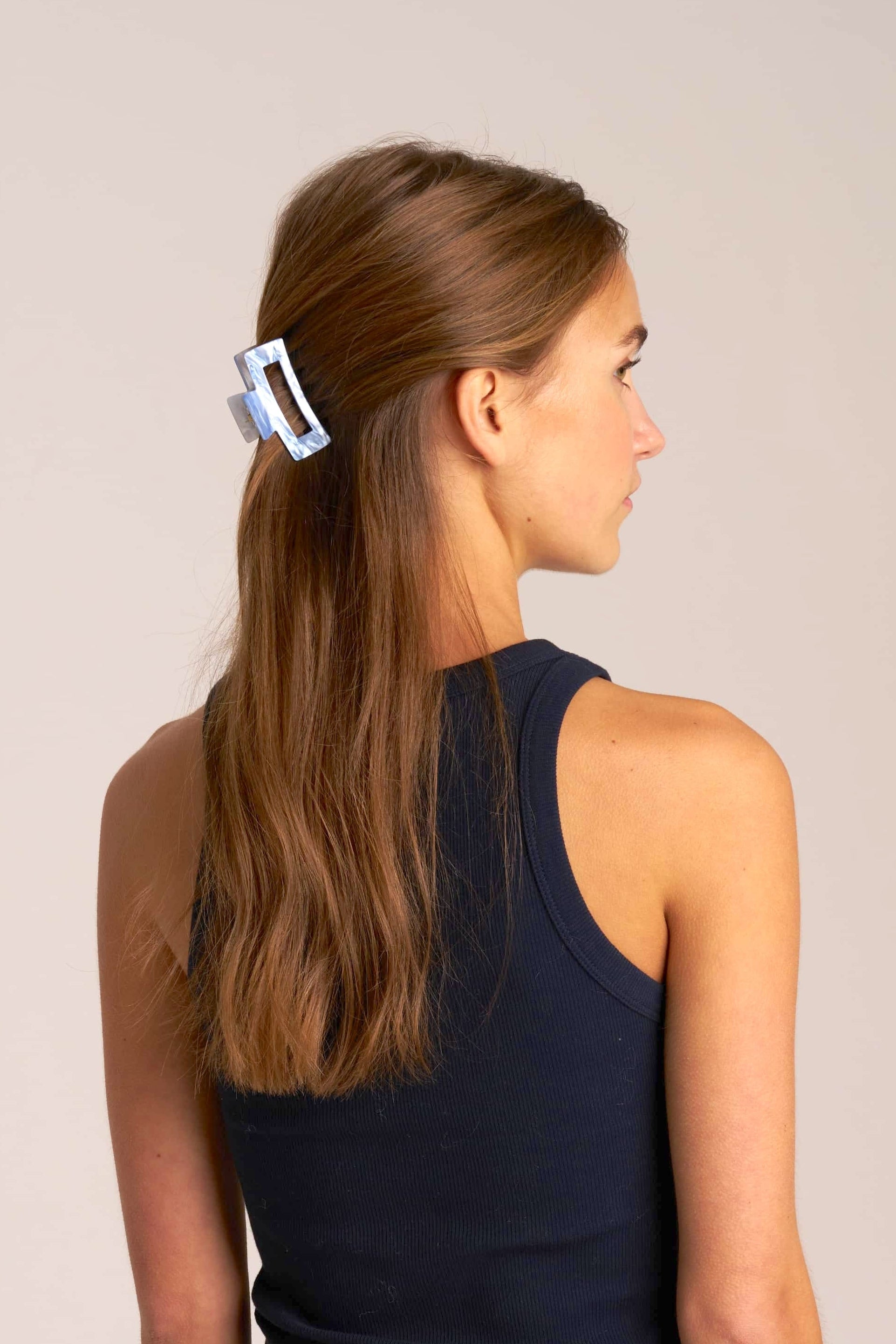 En liten blå hårklämma med glansig finish – stilren, smidig och enkel att använda. Perfekt för halvuppsättningar eller för att samla mindre sektioner av håret på ett snabbt och fint sätt.