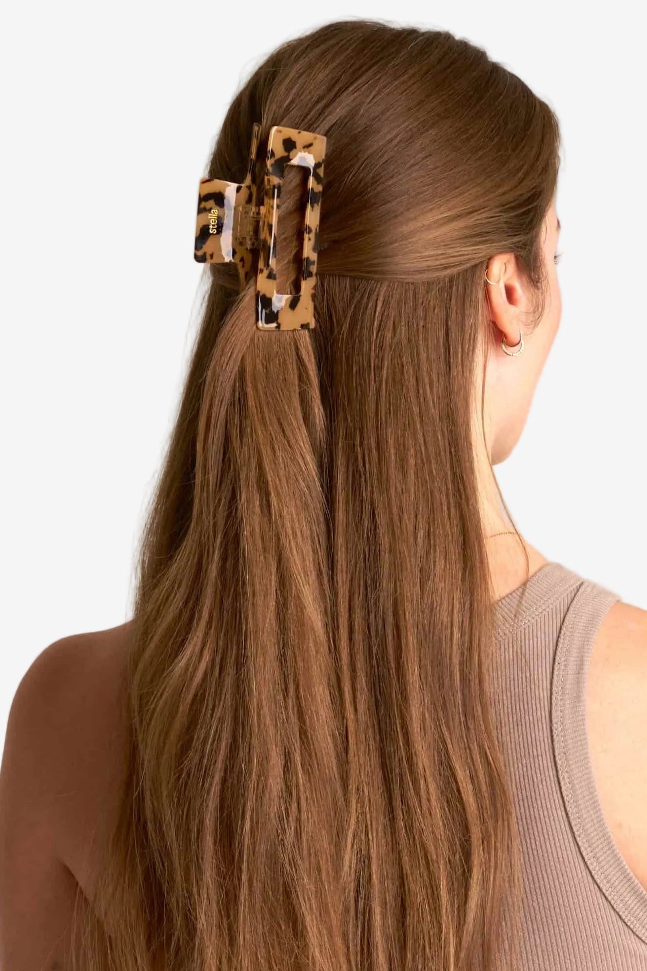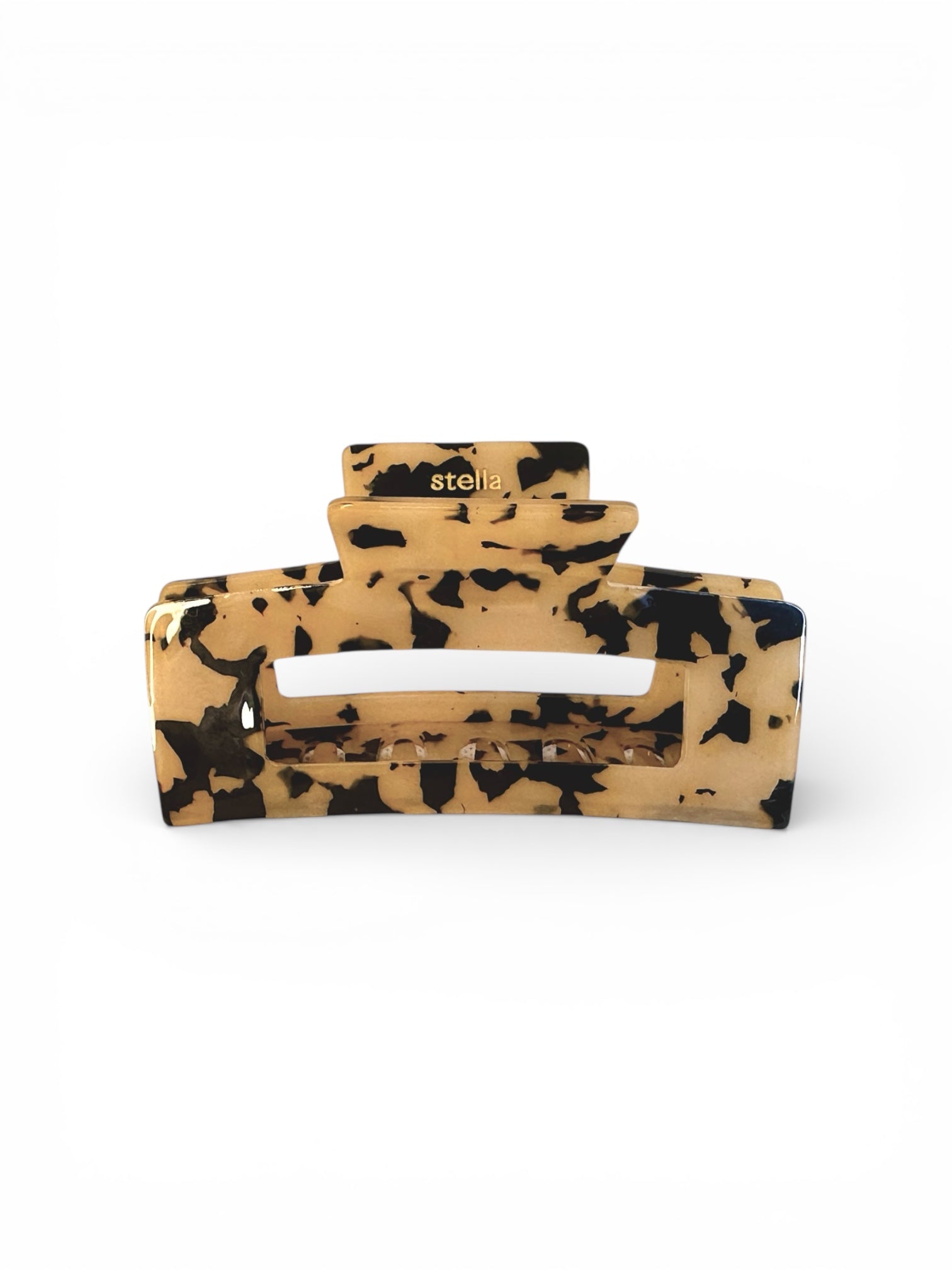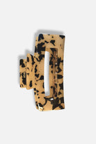 En stor hårklämma i brunt och svart med glansig finish – elegant, enkel och stilren. Formen är klassisk och följsam, med ett stadigt grepp som håller hela håret på plats.