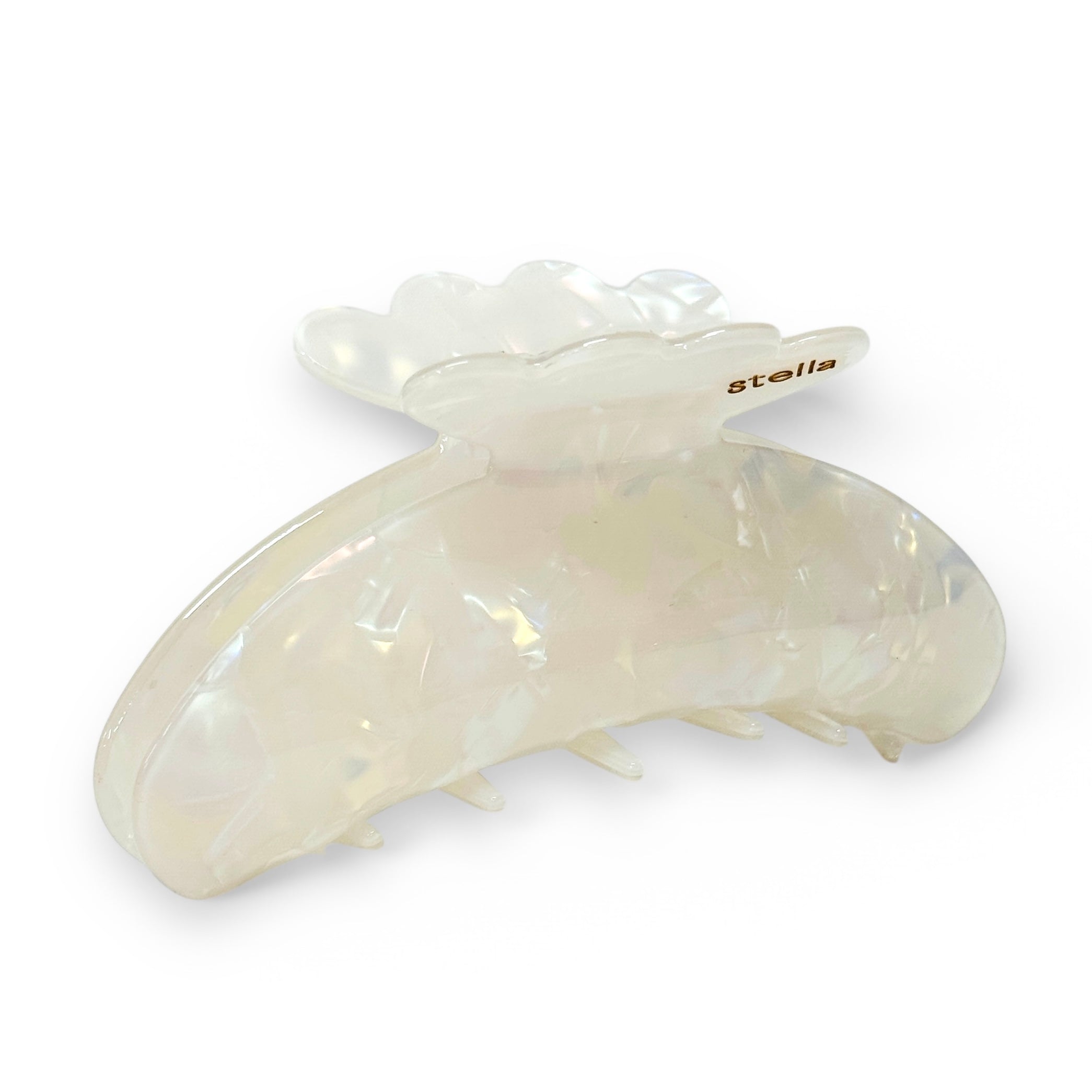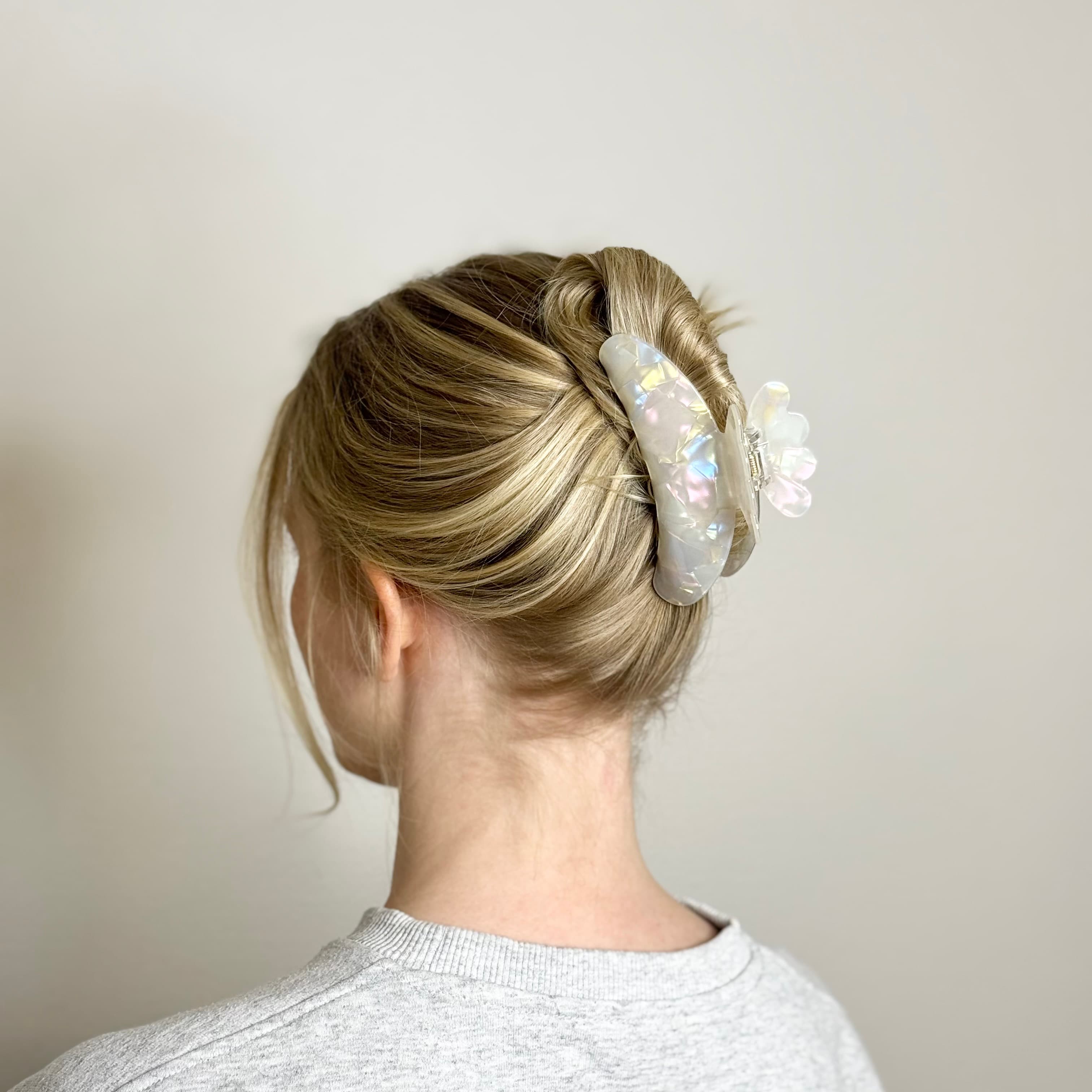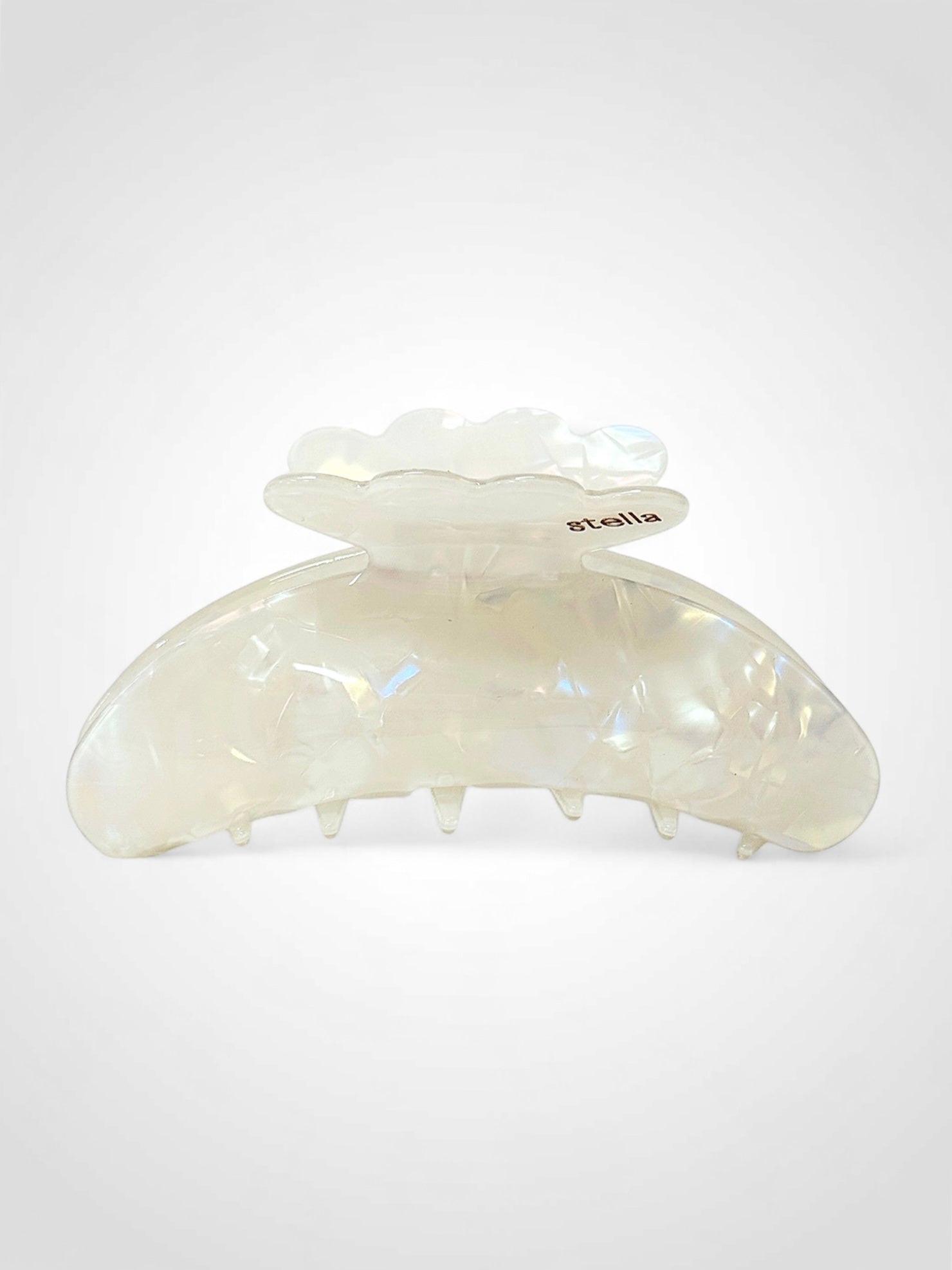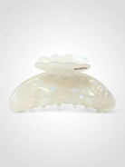 En stor skimrande vit hårklämma med vågformad design och rundade kanter – skapad för att samla upp hela håret på ett bekvämt och enkelt sätt. Den håller ordentligt utan att kännas stram, och är skonsam mot håret även när den sitter i hela dagen.